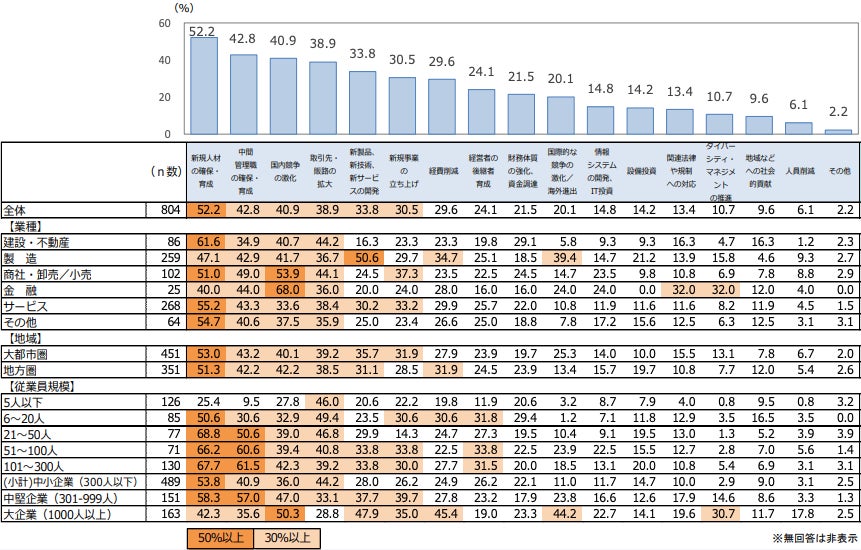 ここ数年、企業経営上の課題として下記が上位3位に上がっており特に新規人材の確保育成に課題を抱えている企業が半数を占めている(複数回答可)