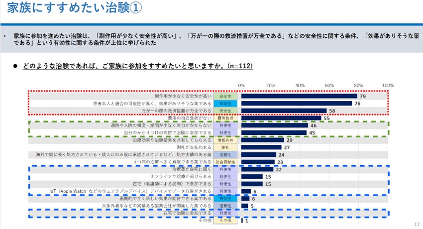 当社が共同で実施した、患者家族向けの治験に対する意識調査結果※3によると、『どのような治験であれば、家族にすすめたいと思うか』※図(1)では、モジュールベースのDCT環境についてが下位となり(青枠)、唯一、かかりつけ医で治験に参加できる環境(緑枠)が、利便性観点においては上位に入る結果となりました。