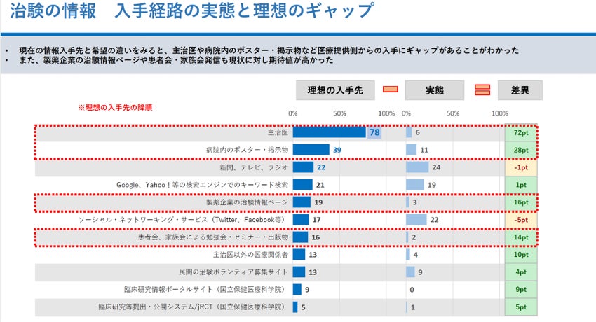 また、『どのようなところで治験に関する情報を得られると良いと思うか』※図(2)では、※図(1)同様に元々関係性を持つ主治医やかかりつけ医療機関からの情報入手経路(赤枠)が上位の結果となりました。