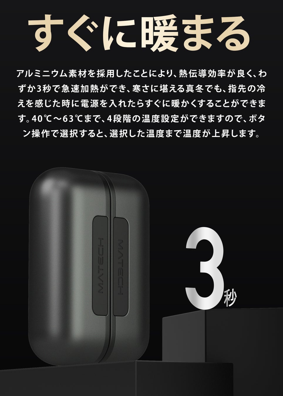 アルミニウム素材を採用したことにより、熱伝導効率が良く、電気カイロの加熱を起動してすぐに暖まります。40℃~63℃まで、4段階の温度設定ができますので、ボタン操作で選択すると、選択した温度まですぐに温度が上昇します。