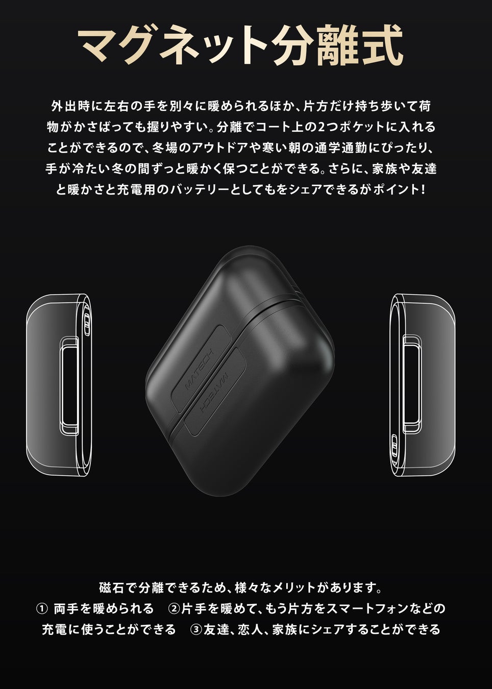 【MATECH】充電式カイロを分離してシェアできる「PowerWarmer Split」を販売開始