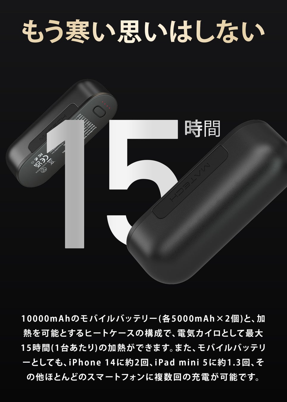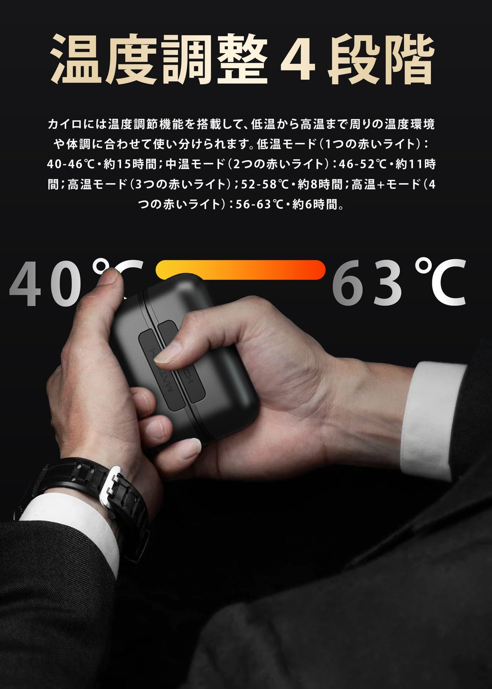 最大63℃、最大15時間連続使用が可能な充電式カイロ