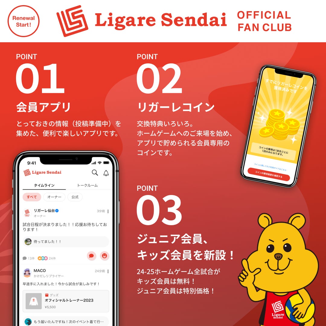 アプリを使い、今まで公開出来なかった選手達の姿やチーム運営の裏側の発信や、コインプログラムを使った集客や特別な特典・イベントなど、皆さんに楽しんでいただけるコンテンツを準備していきます。チームを応援してくださっているスポンサー様・行政とも様々な企画をしながら、今までと一味違うリガーレ仙台ファンクラブを作っていきたいと思います!