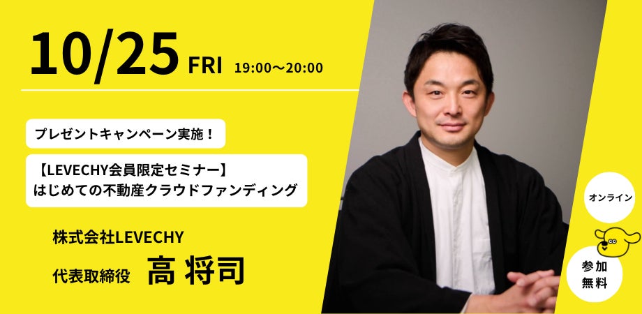 不動産クラウドファンディング「LEVECHY(レベチー)」を展開する株式会社LEVECHY(所在地:東京都港区赤坂、代表取締役:高 将司)は、2024年10月25日(金)19:00より、LEVECHY会員限定の無料オンラインセミナー「はじめての不動産クラウドファンディング」を開催いたします。