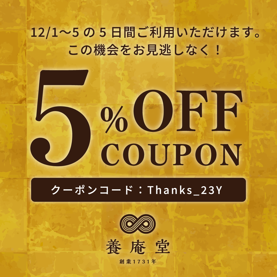 12月1日(金)~5日(火)の期間中であれば、公式ショップで何度でもご使用いただける5%オフクーポンをプレゼント。