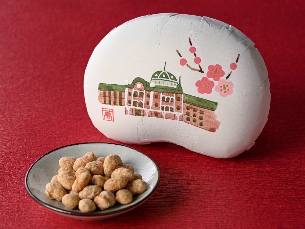 豆箱には東京駅限定の丸の内駅舎と梅の花をあしらいました。