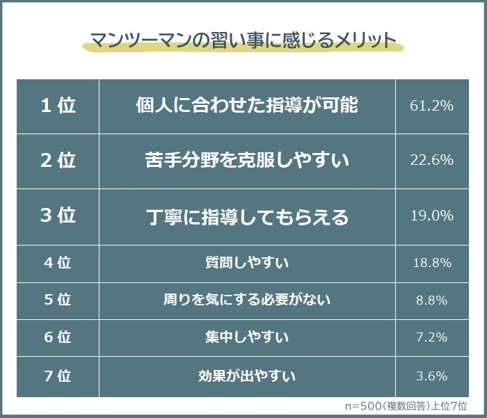 「マンツーマンの習い事に感じるメリット」の1位は「個人に合わせた指導が可能(61.2%)」で、6割以上の人から票を集めました。2位「苦手分野を克服しやすい(22.6%)」、3位「丁寧に指導してもらえる(19.0%)」が続きます。