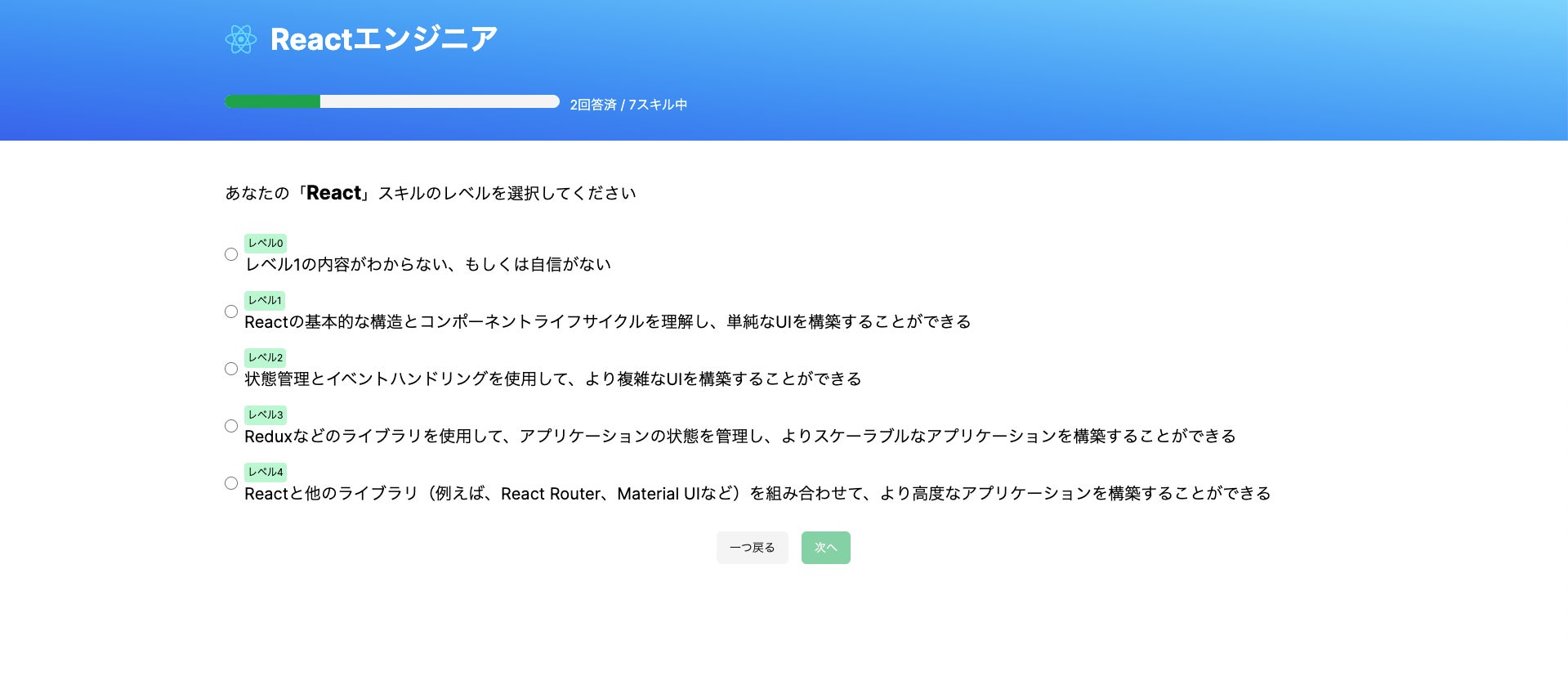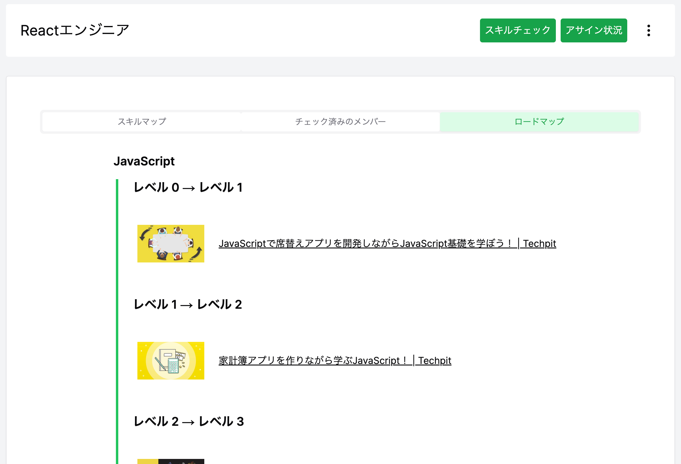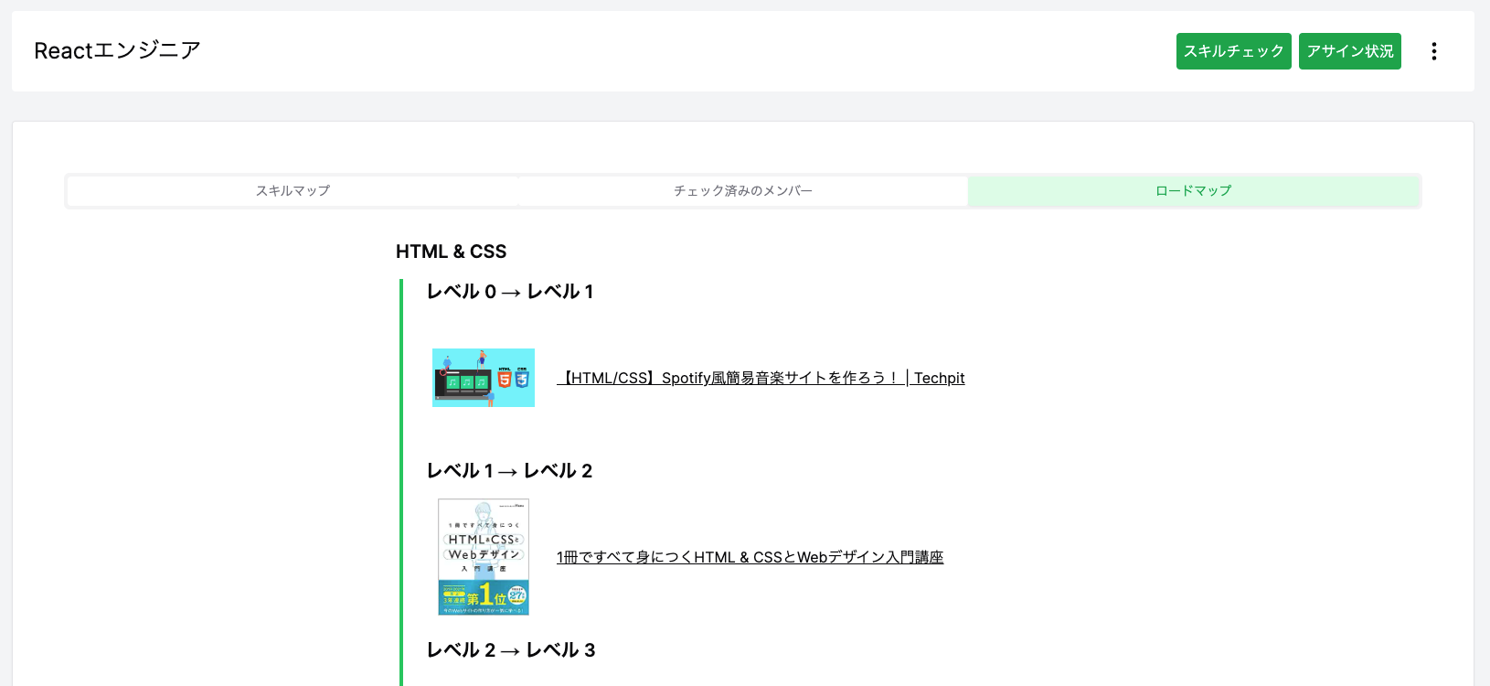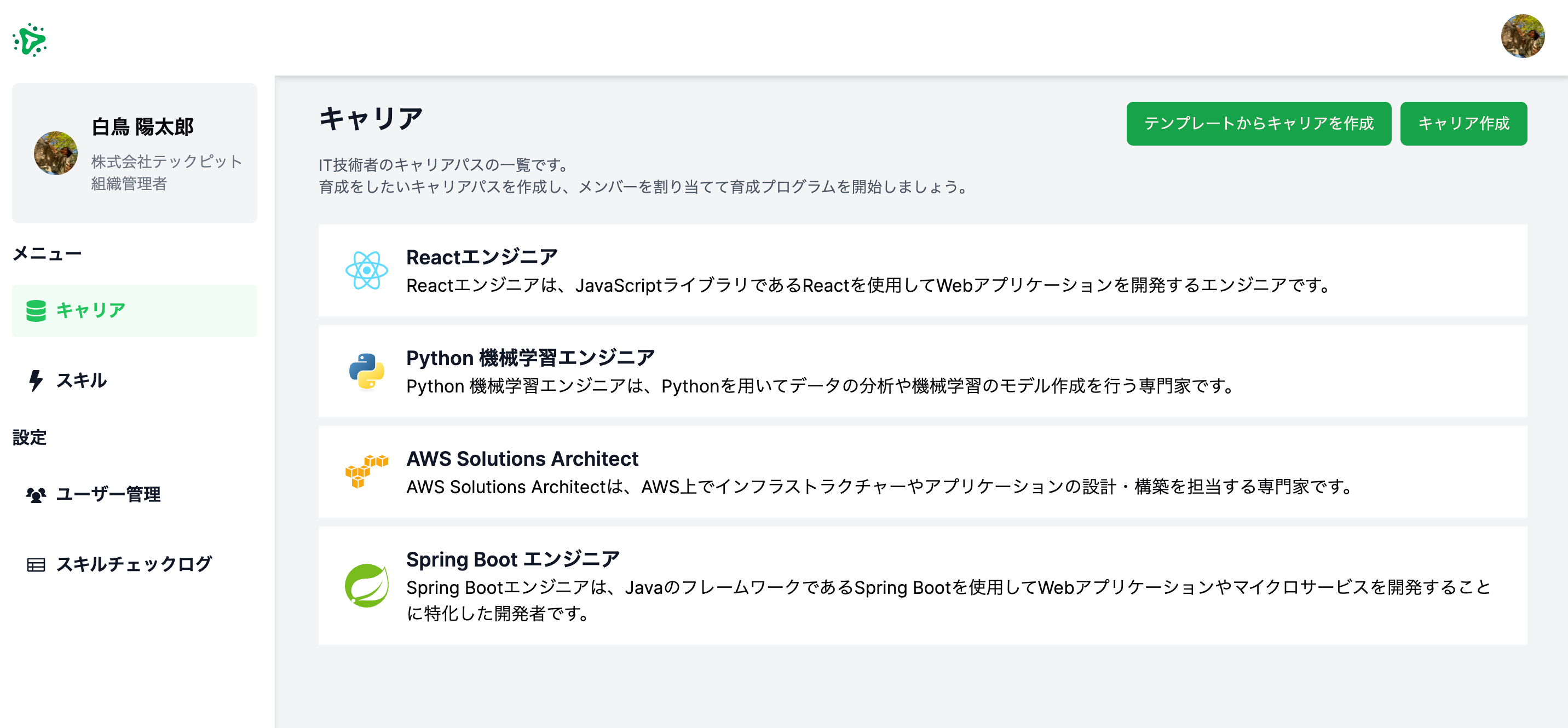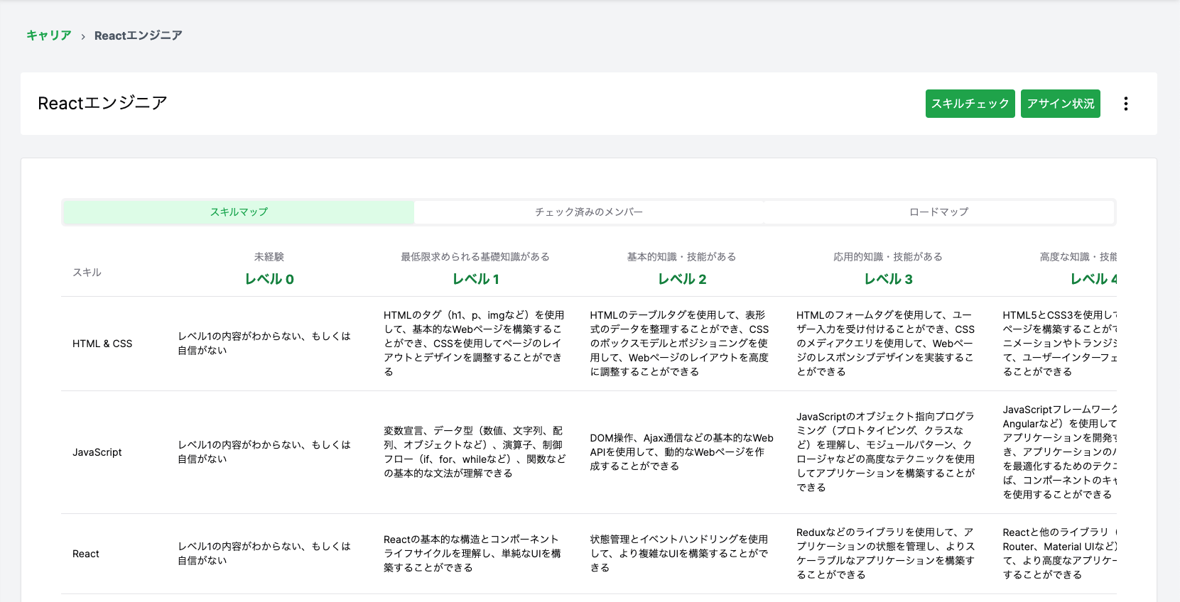 ・標準のテンプレート:AWS Solutions ArchitectやReactフロントエンジニアなどのテンプレートからスキルマップを作成することができます