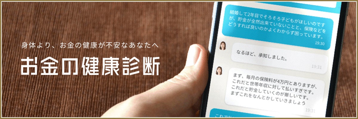 スマホから居住地や年齢、年収、家族構成などの質問に答えるだけで、同地域・同年代の人と比較し、ユーザーの家計状況を診断。自分と似たユーザーと貯金額や投資額を比較して傾向などを受け取ることができます。その後、診断結果をもとにFP(ファイナンシャルプランナー)やIFA(金融商品仲介業者)等のお金に関する専門家からアドバイスコメントが届き、ユーザーはチャットで気軽に無料相談することができます。http://okane-kenko.jp/