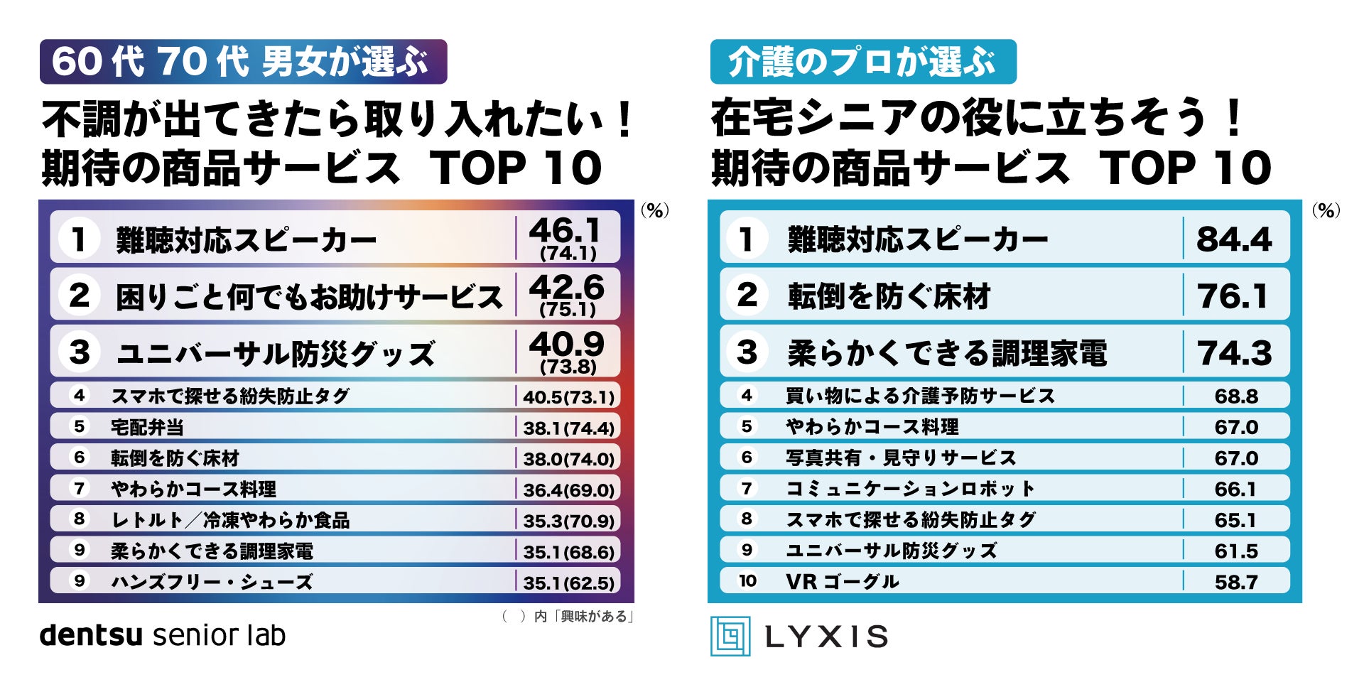 1.シニアが「不調が出てきたら取り入れたい」商品サービス1位は「難聴対応スピーカー」。Top10には「課題解決型エイジテック」が多数ランクインし、浸透の兆しが見える。