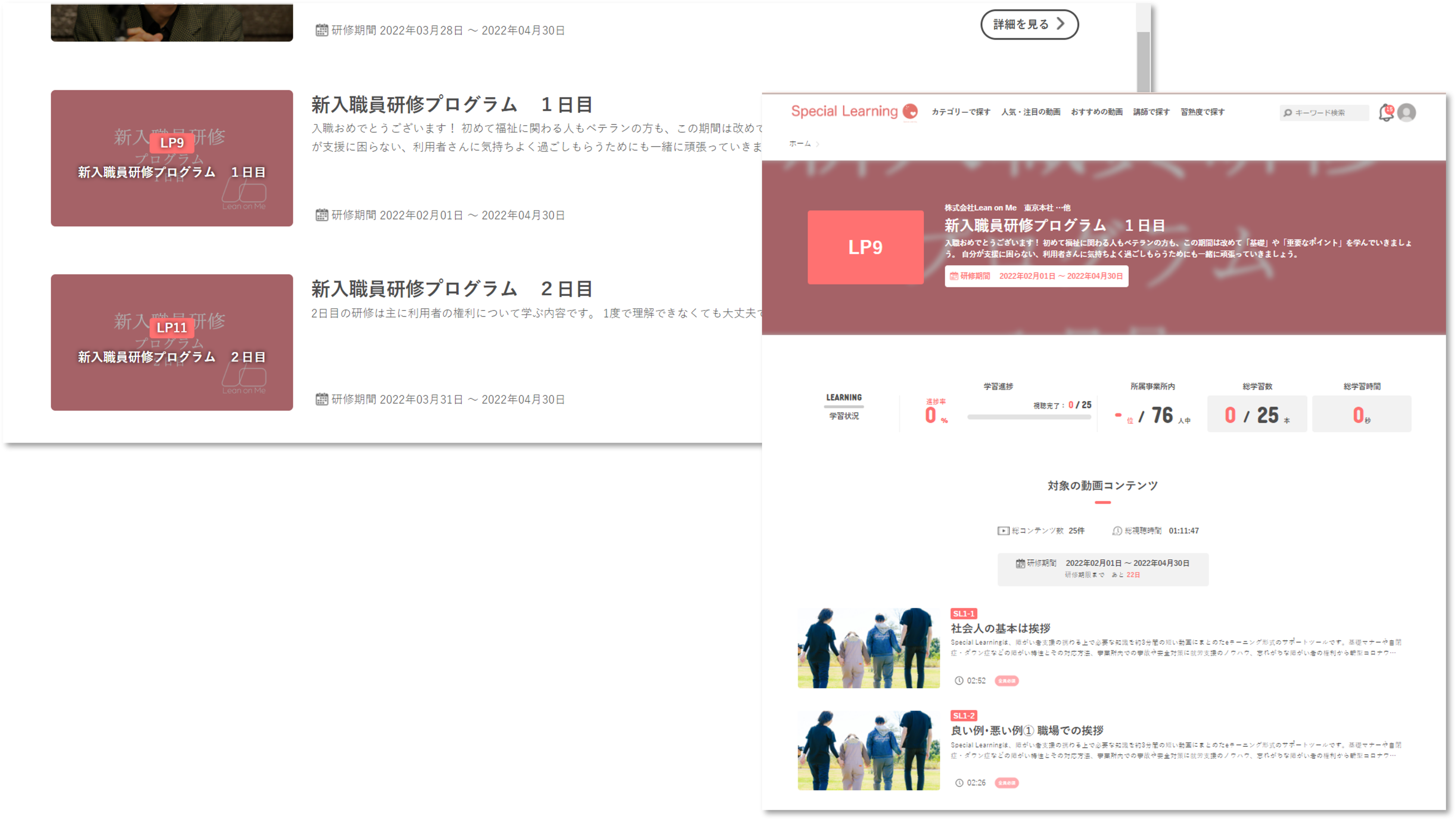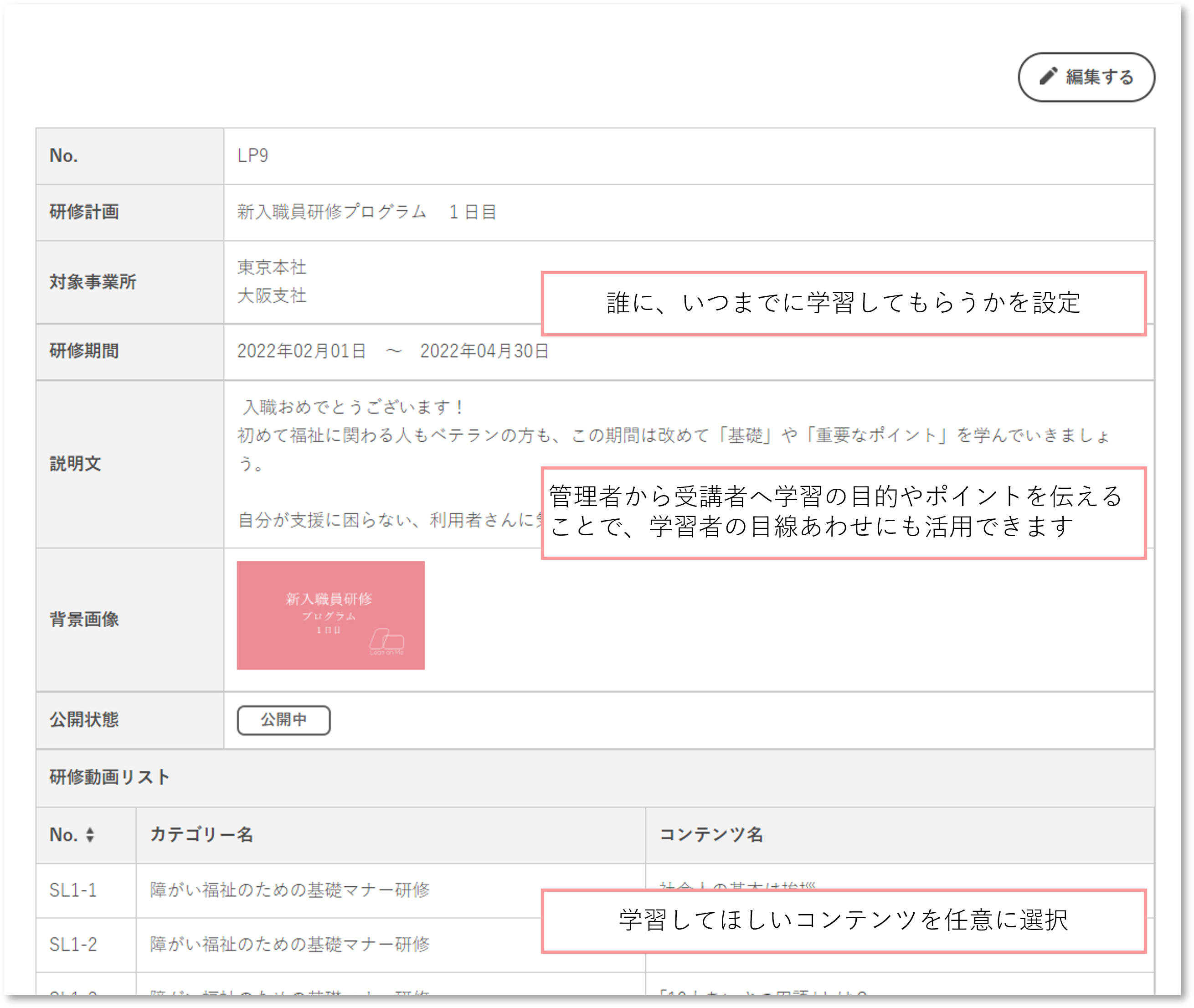 多数のコンテンツの中から、例えば「新入職員研修(1日目)プログラム」計画を立て、新入社員へ必ず見てほしい、障がい福祉サービスの基本的な制度や、ご利用者様へのマナー・挨拶、といったコンテンツを自由に選択し、対象の学習者へ視聴を促すことが可能です。
