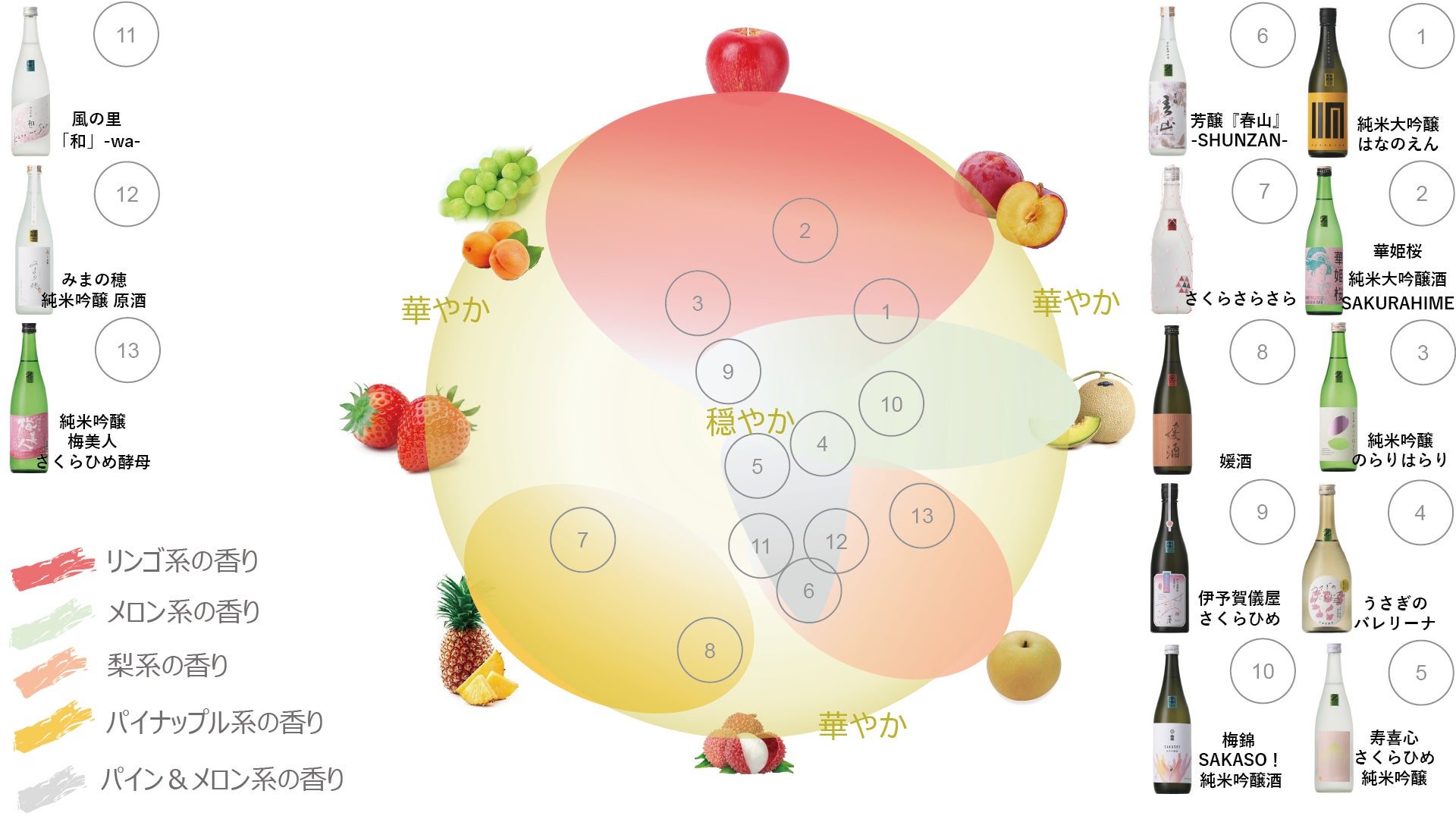 愛媛県酒造組合が開発した新たな日本酒シリーズ「愛媛さくらひめ」の全22銘柄を中心に、日本酒アロマチャート(仮称)を実店舗・イベント・ECサイトにおいて試験的に実装した結果を報告します。