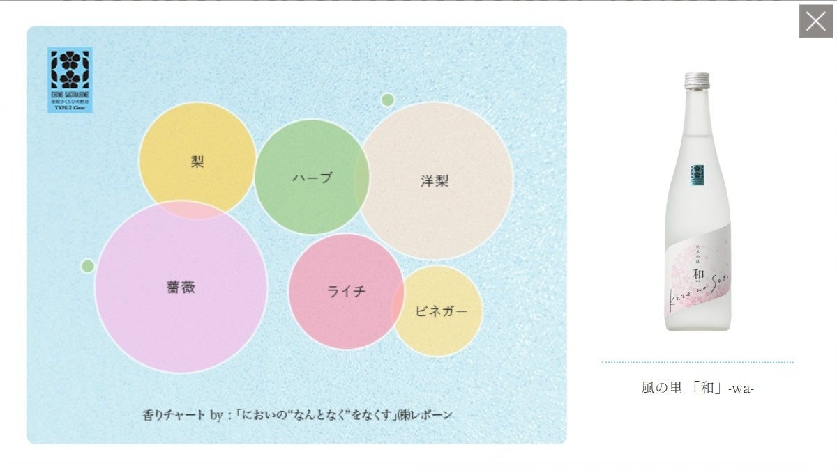レボーンの専門家が開発した、日本酒の香りの厳密な基準に基づく官能評価をもとに、分かりやすいチャートに表現したもの。買う前・飲む前に、または飲みながら、日本酒が持つ繊細で豊かな香りを多くの方々に楽しんでいただく目的。将来的には、レボーンのセンサーとAIによりチャートの自動生成を目指す(開発中)。