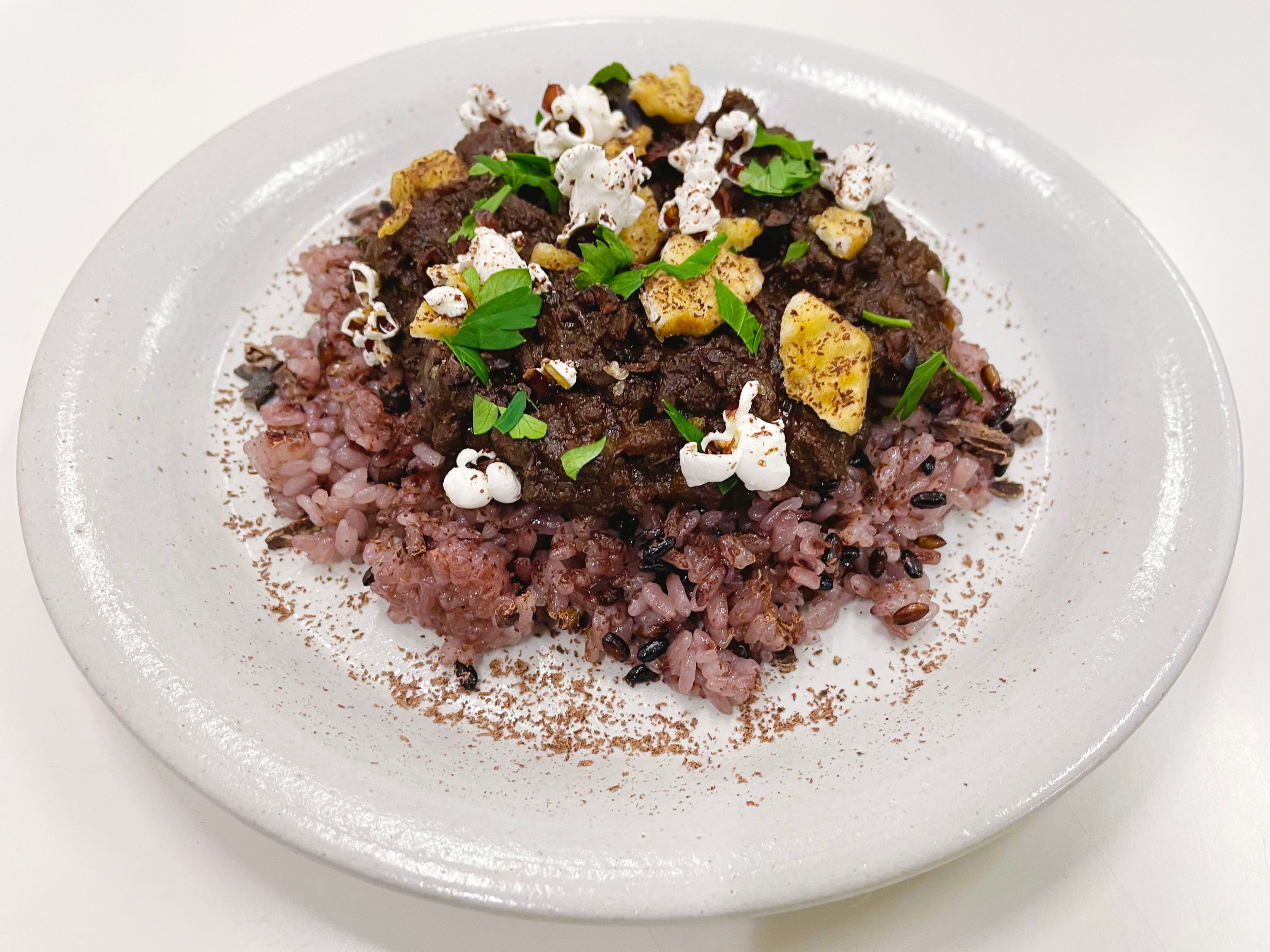 今回は料理・カクテルともにカカオを使用し、玄米ソイミートにカカオとバナナを合わせた「カカオのヴィーガンカレー」には、カシスとカカオにノンアルコールの赤ワインを合わせた「Madagascar(マダガスカル)」がペアリング。