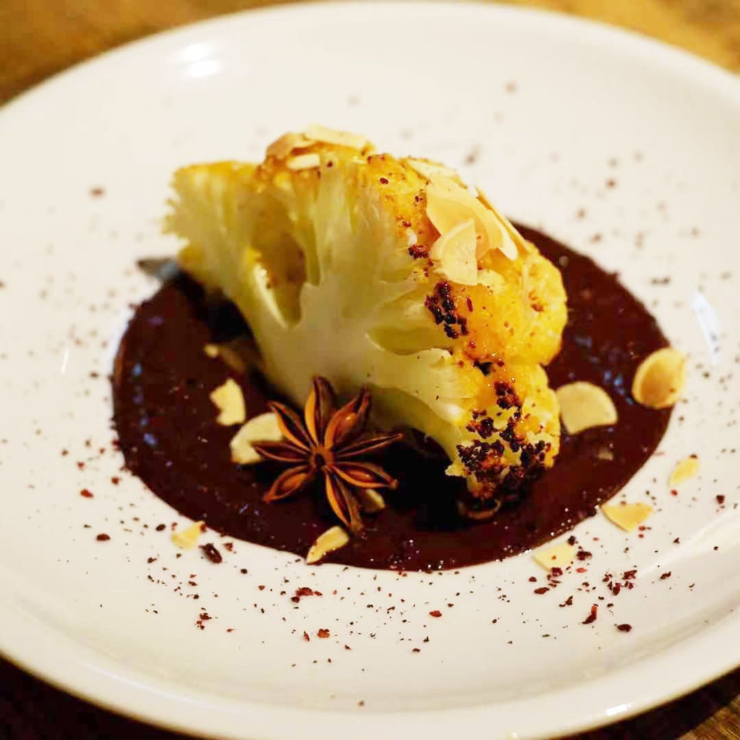 オレンジの香りをまとったカリフラワーのローストに、スパイシーな濃厚チョコレートソースを合わせた「カリフラワーのロースト〜カカオのソース〜」には、ライチとバラの要素にカカオとノンアルコールの白ワインを合わせた「Ecuador(エクアドル)」がマッチ。