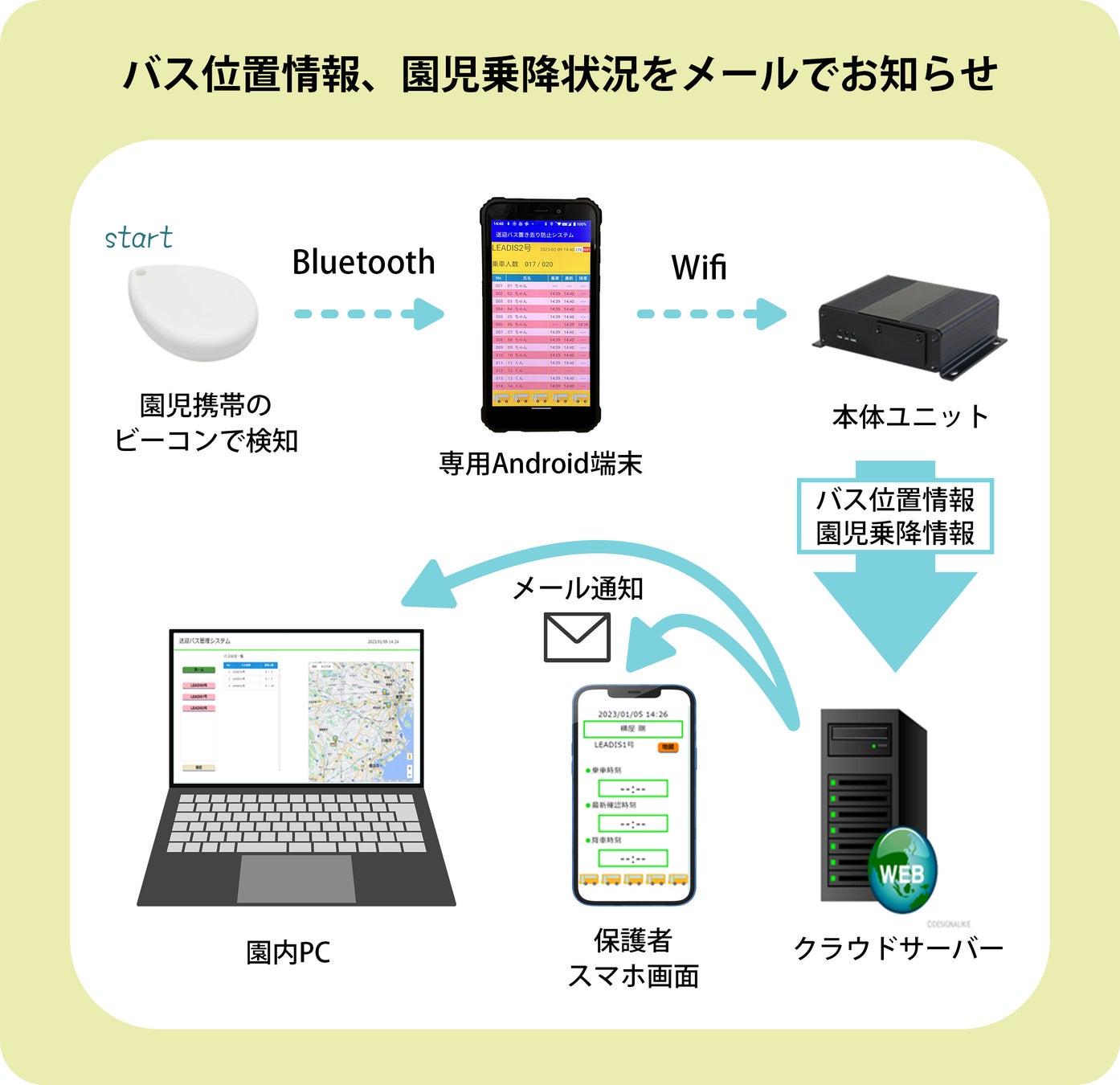 送迎バスに乗車する全園児にビーコン(発信機)を常時携帯させ、バスには受信機(専用Android端末)を設置することで、バスに乗車している園児を自動で検知します。