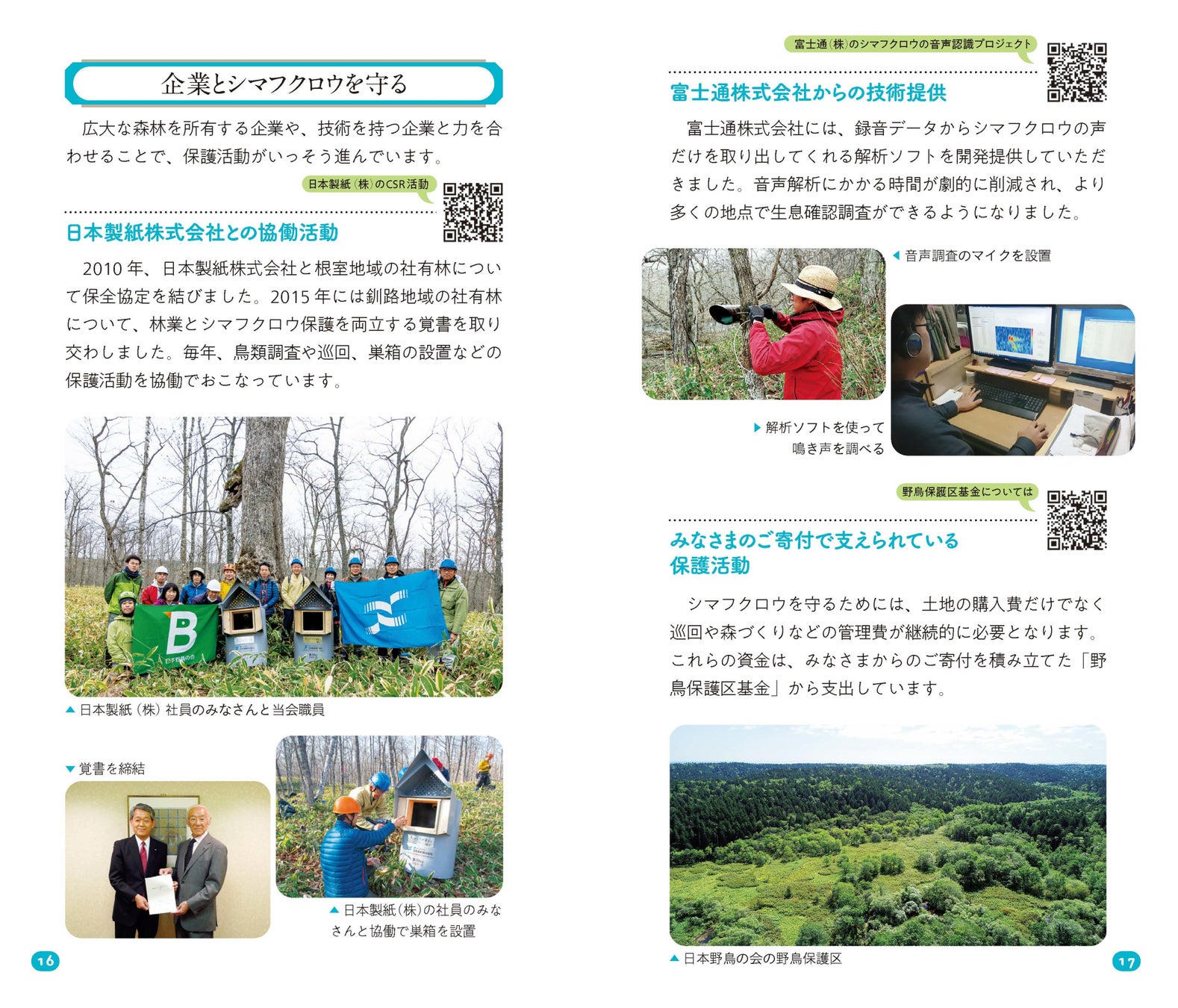 シマフクロウの生態などの基礎知識、減少してしまった原因、シマフクロウを守るための保護活動などを豊富なイラストと写真とともに解説した小冊子にまとめました。また、近年では企業との連携で保護活動が進んでおり、その協力関係についても記載しています。