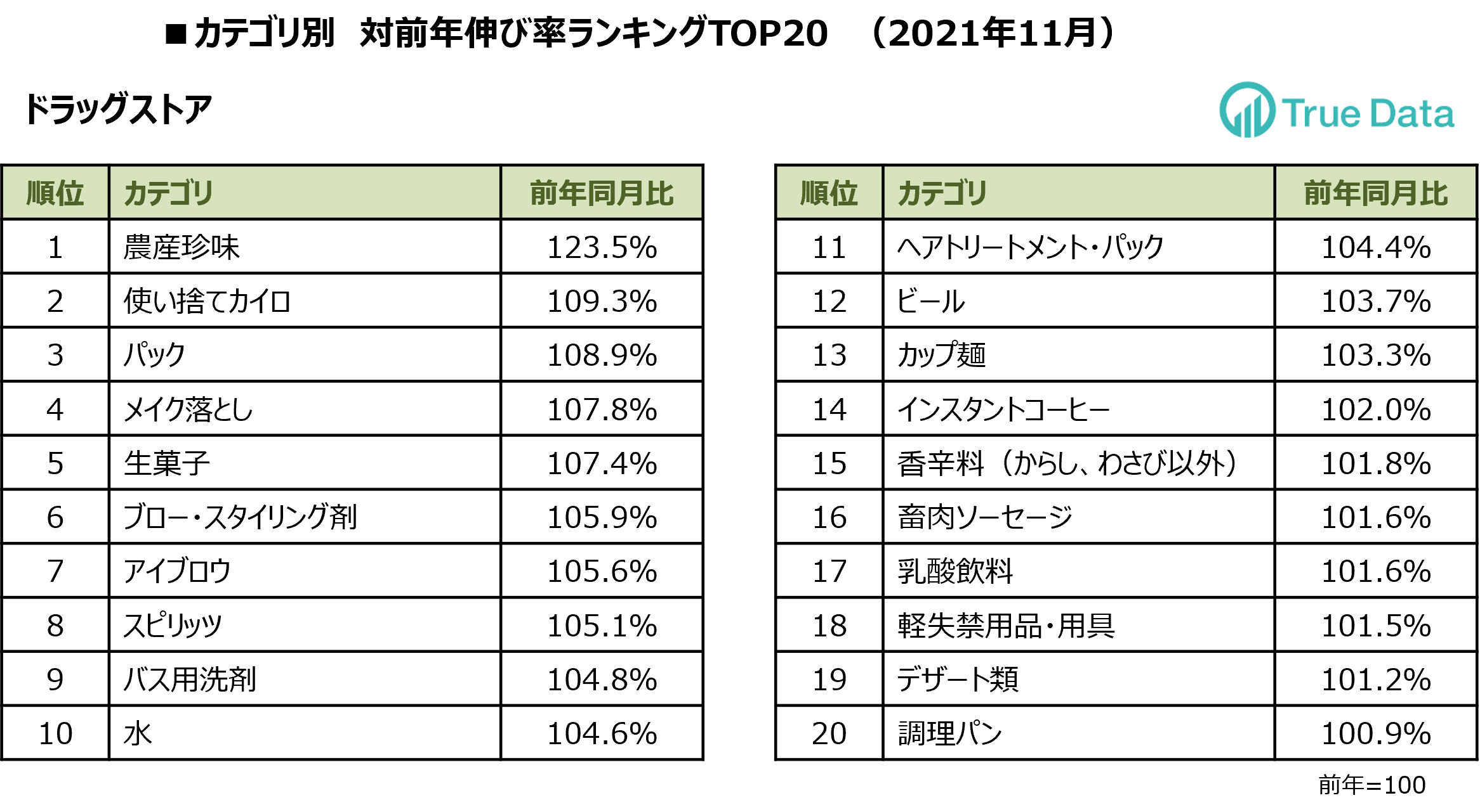 - ドラッグストアで11月に最も売り上げを伸ばしたのは「農産珍味」(甘栗、ミックスナッツなど)で、前年同月比23.5%増でした。9月から3カ月連続で伸び率ランキング1位を記録しています。ヘルシーなおやつや、おつまみとして購入されていると考えられます。