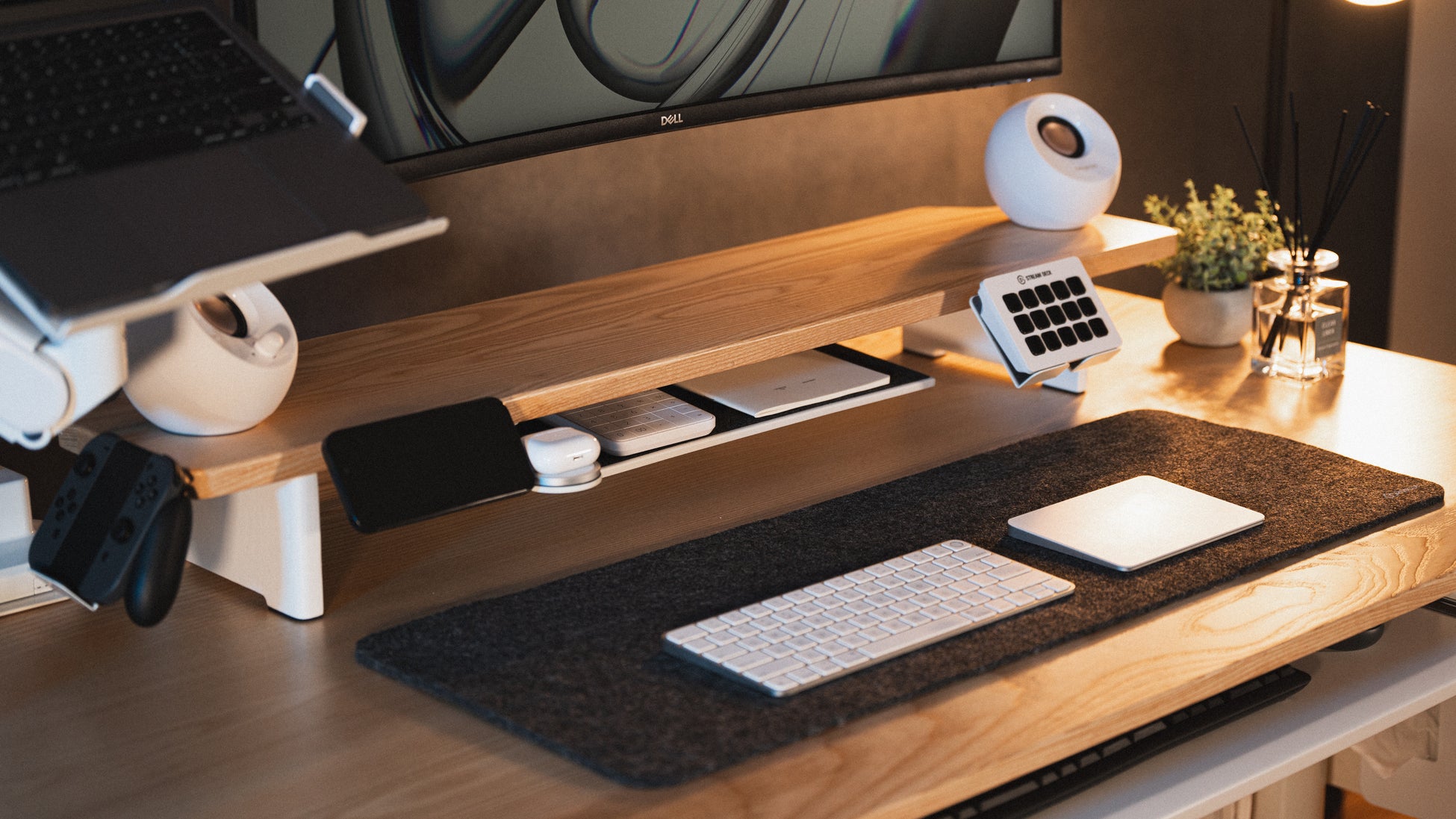 たとえば棚板モジュールを追加して手元に収納スペースを作ったり、モニターアームを取り付けて最大27kgの大型ディスプレイを設置するといった拡張が思いのままです。そのほかPC本体を収容するトレイや折りたたみ式カップホルダー、ケーブルオーガナイザーやデスクマットなど、多彩なオプションで自分だけの理想のワークスペースを構築できます。