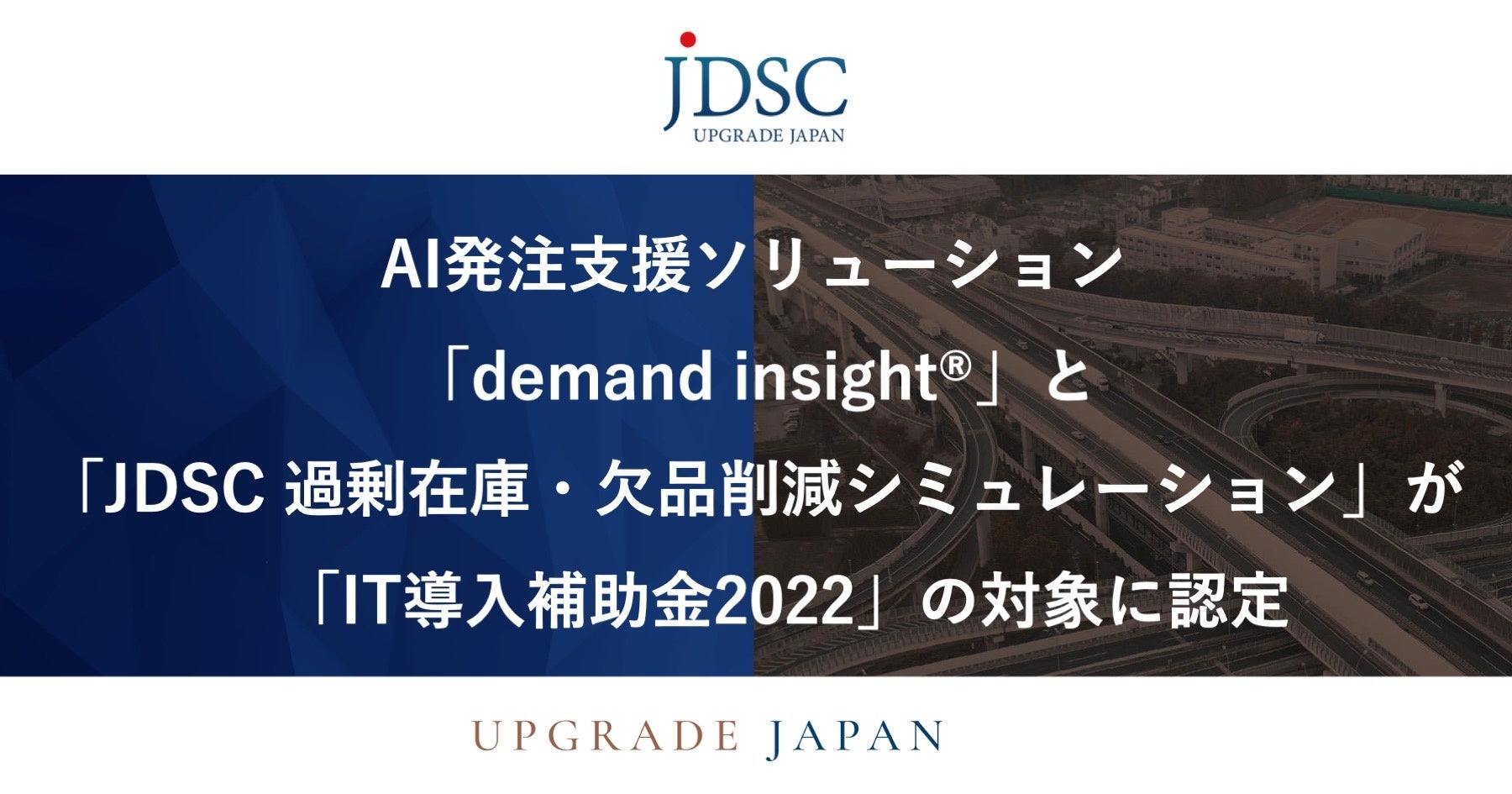 株式会社JDSC(本社:東京都文京区、代表取締役:加藤 エルテス 聡志、以下「JDSC」)は、高精度なAIによる需要予測から在庫計画やコンテナ計算まで、一気通貫でお客さまの発注業務をアシストするAI発注支援ソリューション「demand insight®」と、AIを活用した在庫・欠品削減効果を低コストで検証できる「JDSC 過剰在庫・欠品削減シミュレーション」(4メニュー)が、「IT導入補助金2022」(「サービス等生産性向上IT導入支援事業」通常枠A類型)の対象に認定されましたので、お知らせします。