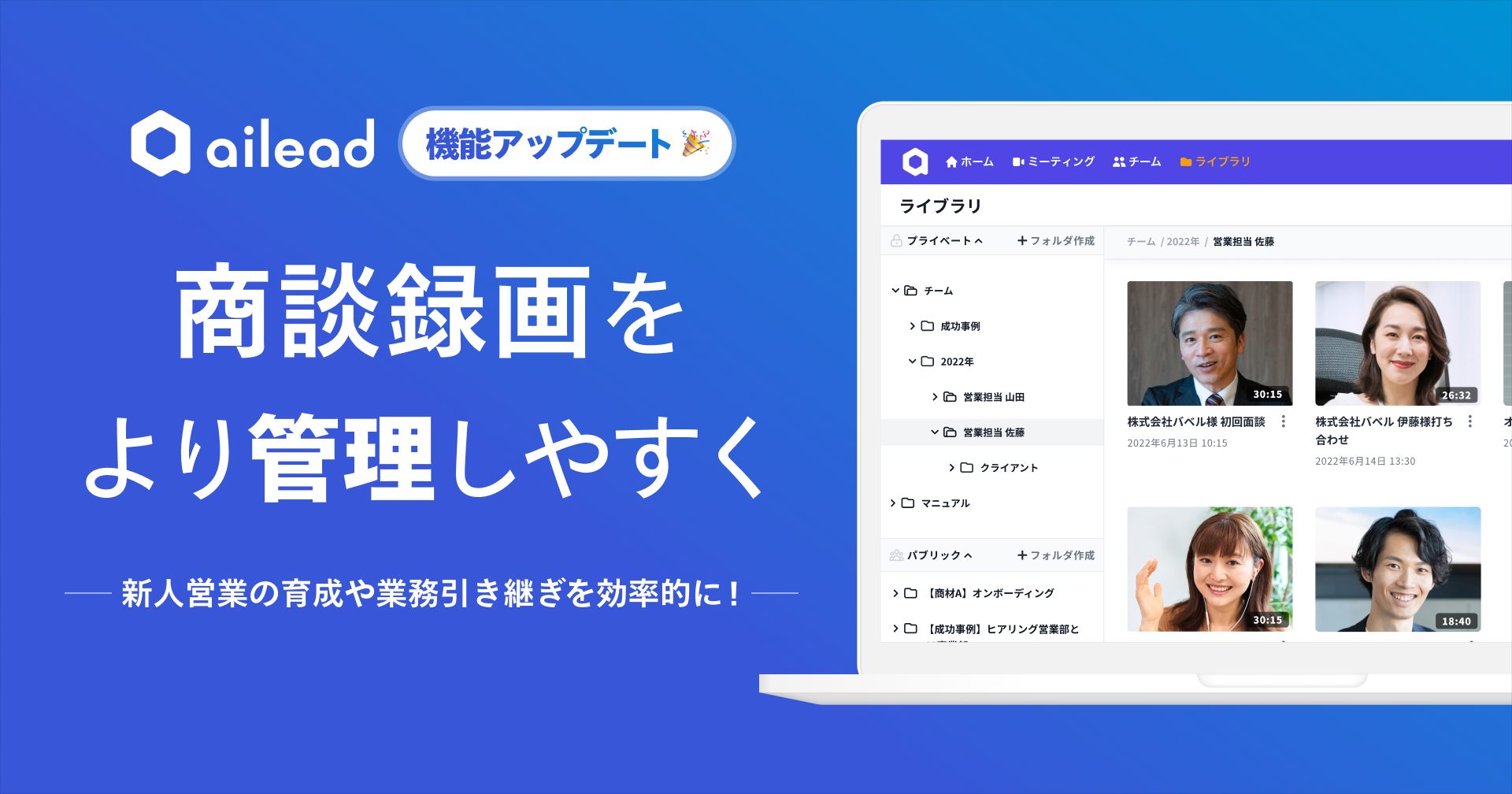 株式会社バベル(本社:東京都渋谷区、代表取締役:杉山大幹、以下バベル)が提供する商談解析クラウド「ailead(エーアイリード)」は、商談録画データをフォルダ管理するライブラリ機能をアップデート致しました。より効率的にチーム内の商談録画・解析データを管理・共有・活用することが可能となります。新人営業を即戦力化するためのオンボーディング教材作成、メンバー間の営業スキル差を埋めるためのトレーニングコンテンツ作成など、商談録画データを分類することで効率的なデータ管理の実現に活用することができます。