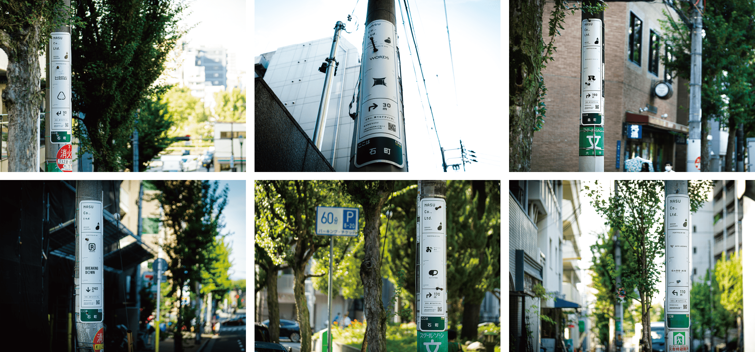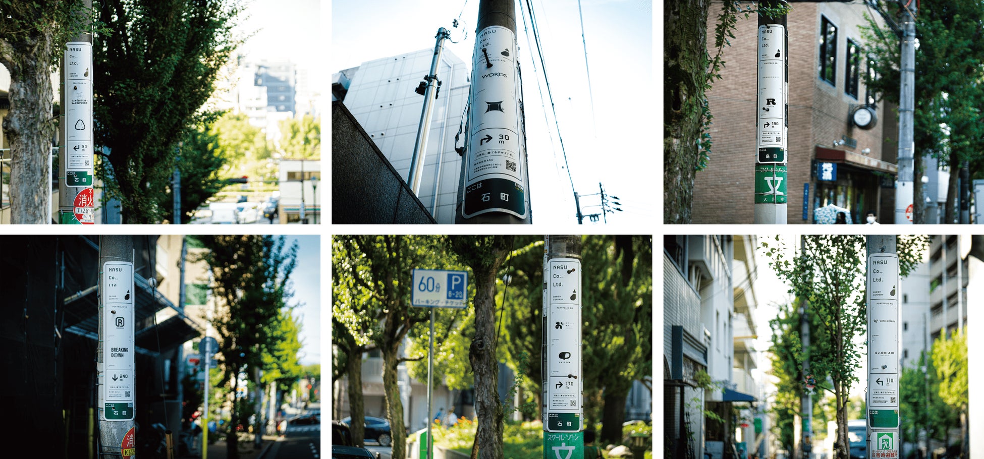 電柱広告のデザインはNASUがこれまで手がけたお仕事実績を掲載しているため、一般的な電柱広告とは異なる「ポートフォリオ電柱広告」となっています。電柱広告6本ともそれぞれ別のデザインの仕様になっています。