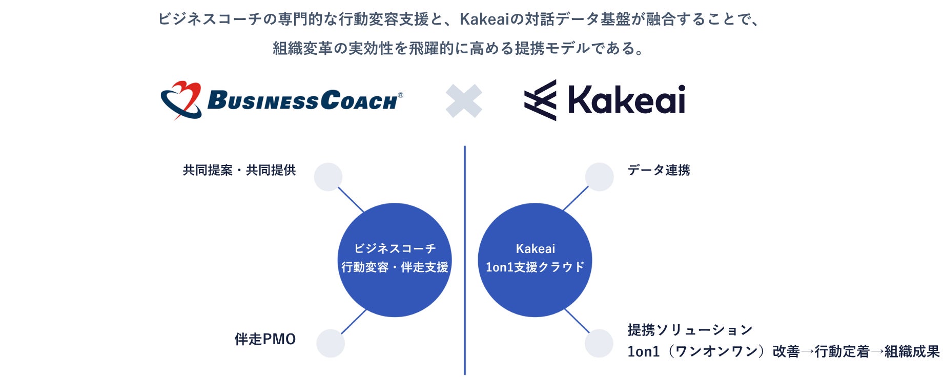 ビジネスコーチ株式会社(本社:東京都港区、代表取締役社長:細川 馨、東証グロース:9562、以下「当社」)は、1on1(ワンオンワン)改善クラウド「Kakeai」を提供する株式会社KAKEAI(本社:東京都渋谷区、代表取締役社長:皆川 恵美、以下「KAKEAI」)と、人的資本経営の実効性向上を目的とした業務提携契約を締結しましたので、下記の通りお知らせいたします。