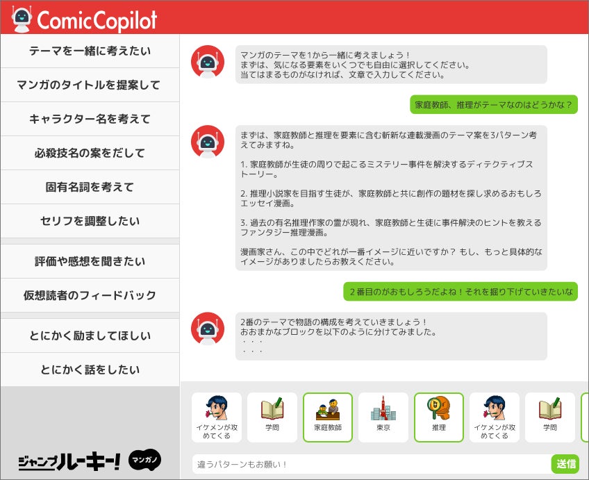 あらかじめ用意されたメニューの中から使いたい機能を選ぶだけで、漫画制作のめんどうな作業や、詰まりがちなアイデア出しなどに対し、AIが相談に乗ってサポートします。