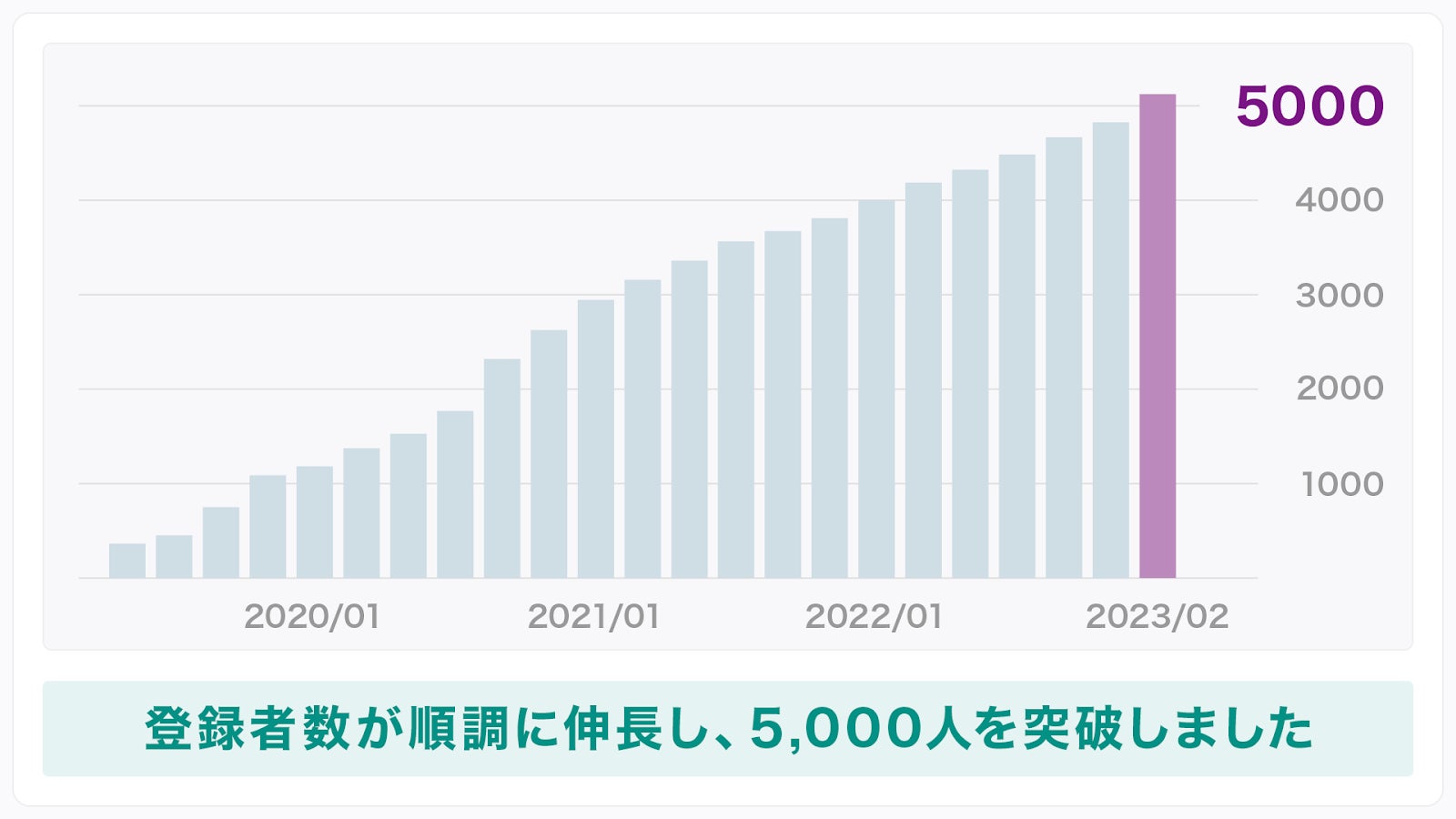統計学やプログラミングなど高度な知識を必要とすることなく、スピーディーに本格的なAI活用ができるサービスとして2019年4月にリリース以降、登録者数が順調に伸長し、この度5,000人を突破しました。