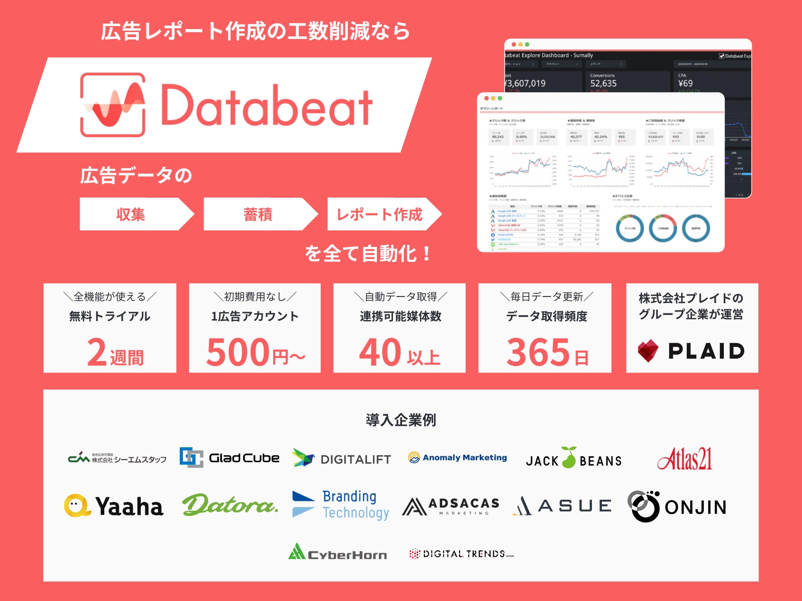 アジト株式会社が開発・提供する広告レポート自動化ツール「Databeat」は、合計40以上の広告媒体や計測ツールと連携してデータの収集から蓄積、レポート作成を自動化できます。