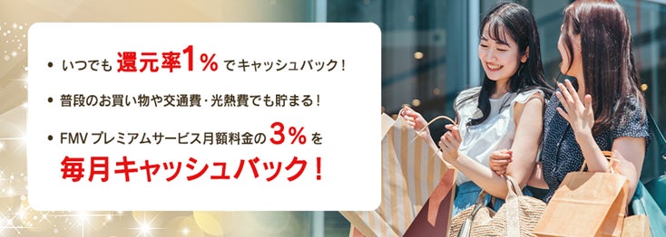 「FMV カード」をお持ちの場合、「WEB MART」でのお買い物の際に、優待割引特典がうけられます※3。さらに、「FMV カード」をご利用いただくと、ご購入代金の1%を現金キャッシュバック※4します。