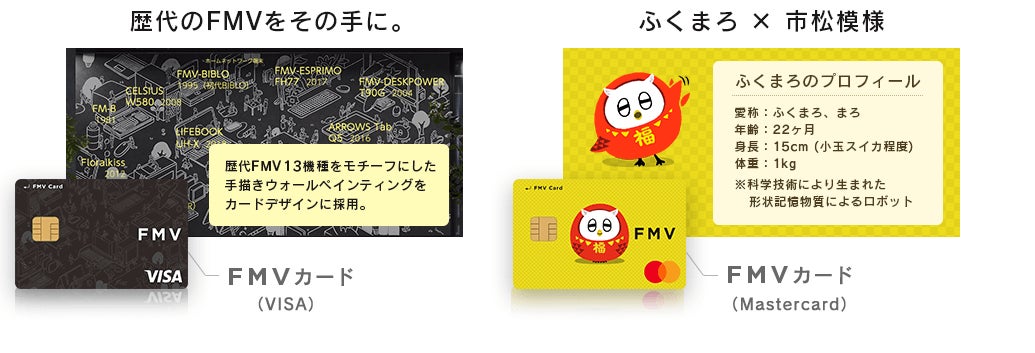 「My Cloud プレミアム カード」では選択できる国際ブランドが「VISA」のみでしたが、「FMV カード」では「Mastercard」を追加し、お客様のご利用状況に合わせて選ぶことができるようになりました。「VISA」カードは、歴代FMVをモチーフにしたデザイン、「Mastercard」カードは、FMVに搭載するAIアシスタント「ふくまろ」が際立つデザインにリニューアルしています。