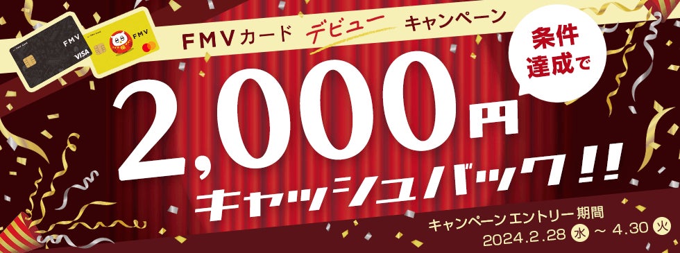 対象期間中に「FMV カード」に新規入会いただいたお客様に向けて「FMV カード デビューキャンペーン」を実施しています。期間内での入会および条件達成で、2,000円のキャッシュバックが受け取れるお得なキャンペーンです。