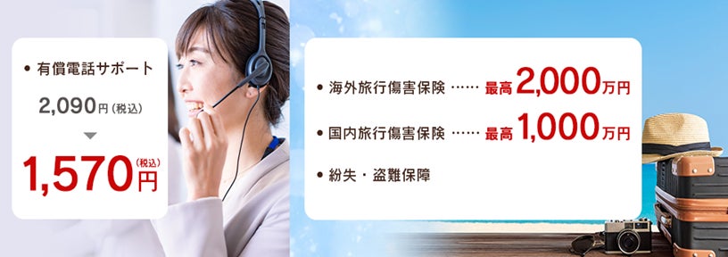 もしもの時に役立つ技術サポート電話を割引価格でご利用いただけるほか、付帯保険・保障サービス(最高2,000万円の旅行保険など)もご利用いただけます。さらに、飲食店やファッションなど全国多数のお店でお得にご利用いただけるオリコ優待クーポンもご利用いただけます。