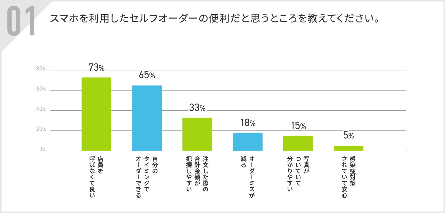 スマホを利用したセルフオーダーの便利だと思う点について、「店員を呼ばなくて良い」が73%で最多、次点は「自分のタイミングでオーダーできる」で65%でした。