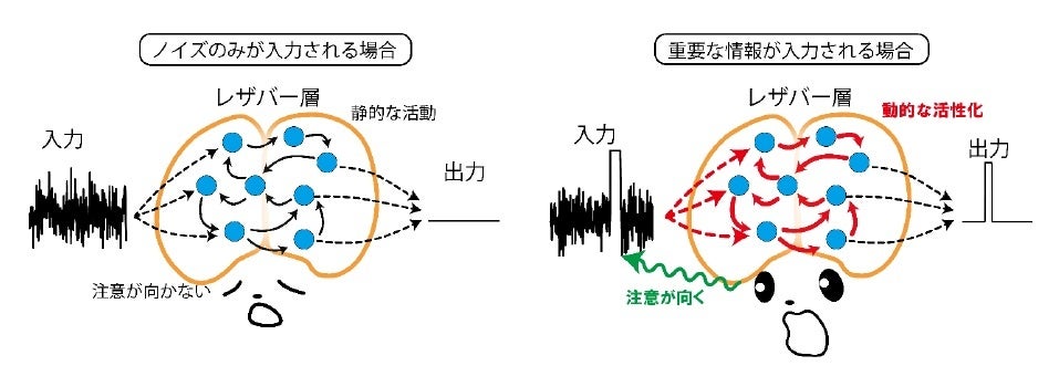 従来式のRCとSM-RCの動作の違いを明確に示すために、単純アテンションタスクを用いて、学習結果の比較を行いました(図2)。単純アテンションタスクでは、入力信号をレザバー層内に保持しているときに、入力ノイズがレザバー層をかき乱してしまうため、従来のRCでは解くことが困難でした。一方で、SM-RCでは、入力信号を保持しているときは、入力ゲートを閉じることでノイズの影響を抑え、さらにスペクトル半径を大きくすることで情報の保持を実現しています。さらに、興味深いことに、この情報保持の間は、レザバー層はカオス状態にあることがわかりました。従来のRCはカオス状態では学習が困難であることが知られていますが、SM-RCではカオス状態も有効に活用していることがわかります。このように、SM-RCは、従来のRCでは実現不可能な複雑なダイナミクスをレザバー層内に引き起こすことで、学習性能を向上させていることがわかりました。