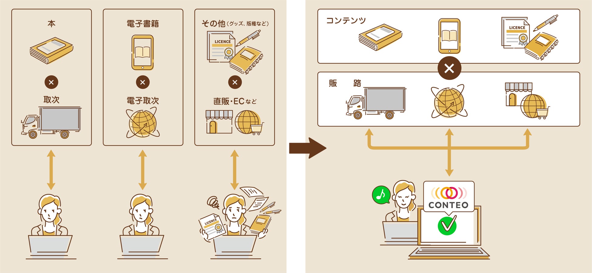 各コンテンツや販路ごとに分散していた管理システムをCONTEOひとつに統合することでコスト削減を実現します。また管理にExcelやAccessなどを使用している場合もCONTEOに統合することで省力化することが可能となります。