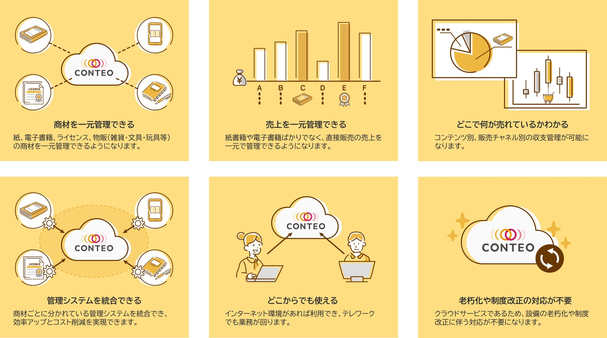 CONTEOは従来の紙の出版物を含む様々なコンテンツ(電子書籍、グッズ、映像作品、版権など)に加え、取次やECサイト、電子書店、その他直販などの多様化する販売チャネルをすべて一元管理することができるクラウド型パッケージシステムです。販売管理をはじめとし、製作原価管理、印税管理、在庫管理をCONTEO一つで実施することができます。登録したデータはファイル形式で出力が可能に、売上分析にも活用可能です。これからの出版社様のビジネス拡大と業務効率化を支え続けます。