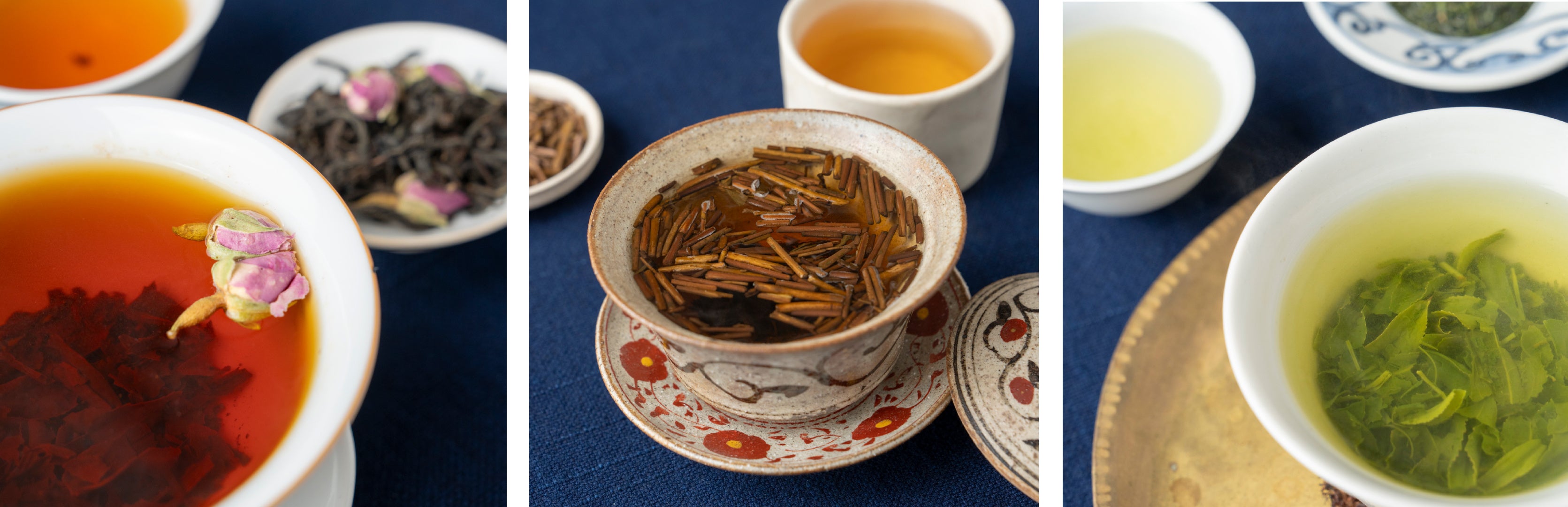 緑茶・ほうじ茶・紅茶は埼玉県所沢市にある狭山茶の農園、お茶の平岡園(以下、平岡園)で生産されたものを提供。平岡園は「武蔵野の落ち葉堆肥農法」が日本農業遺産にも登録されている三富新田(埼玉県入間郡三芳町上富〜所沢市中富・下富)で、江戸時代から続く農園です。緑茶は【造込茶・萎凋香茶 むさしかおり・花香玉緑茶 はるみどり】の3種をラインナップ。ほうじ茶は1種。煎茶や番茶を強火で炒ることで独特の香ばしい香りを出し、葉だけでなく茎も加える事により強い旨味もあり、渋みの少ないスッキリとした飲み心地で甘味との相性も抜群です。紅茶は『三富紅茶とハマナスの薔薇』 さやまかおりを中心に紅烏龍の製法を用いた紅茶や複数年度の複数品種をブレンドした甘くふくよかな紅茶です。三富紅茶と相性の良いグラース産のハマナスの薔薇を合わせ、穏やかで自然な甘みのある芳香がリラックスできる一杯です。