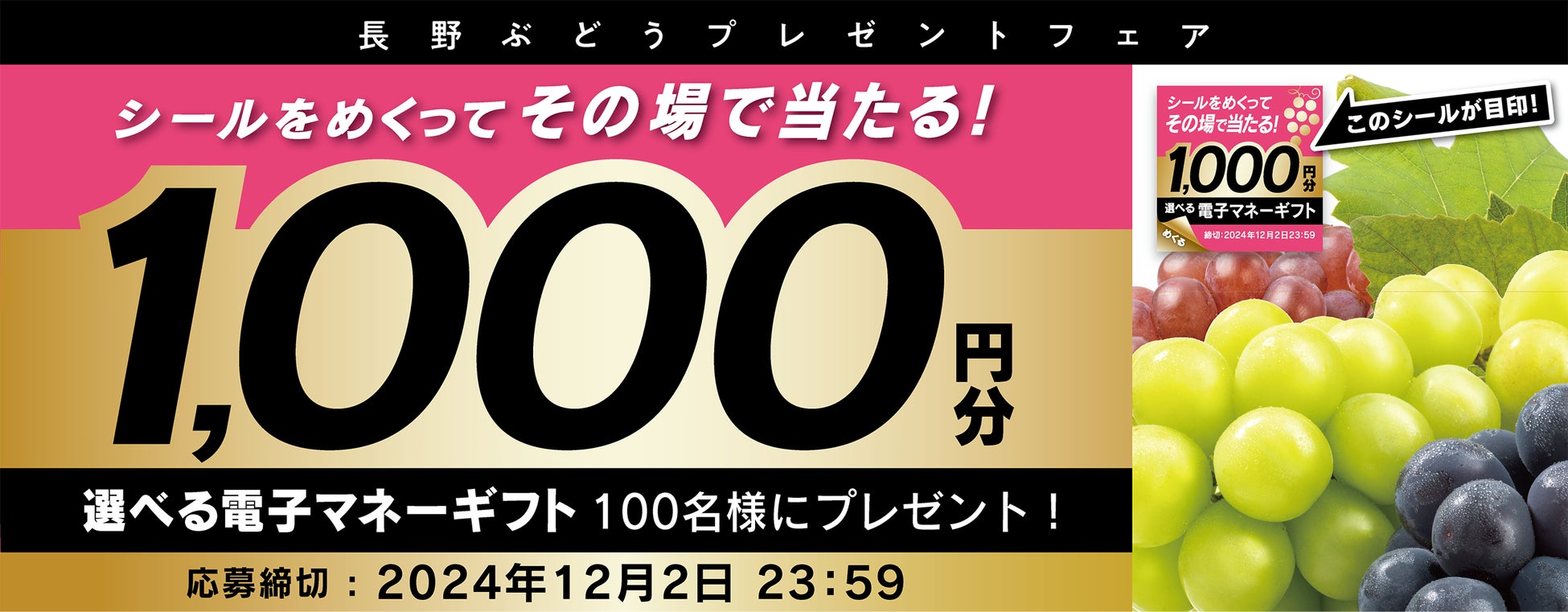 青果の総合流通企業の株式会社ファーマインド(本社:東京都千代田区、代表取締役社長:堀内達生)は、2024年10月8日(火)より、選べる電子マネーギフト1,000円分が100名様に当たる『その場で当たりがわかる長野ぶどうキャンペーン』を実施いたします。