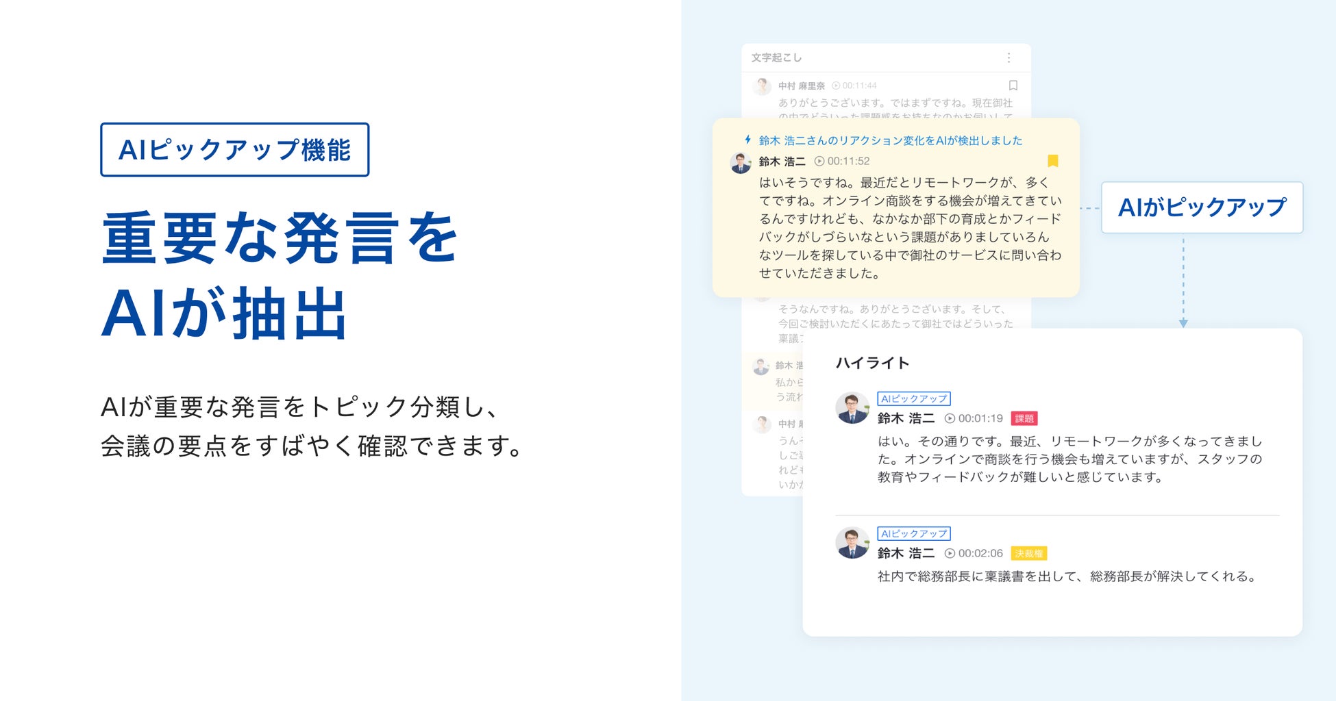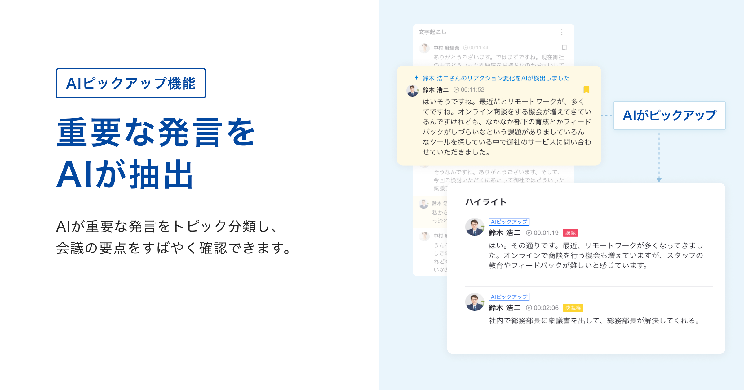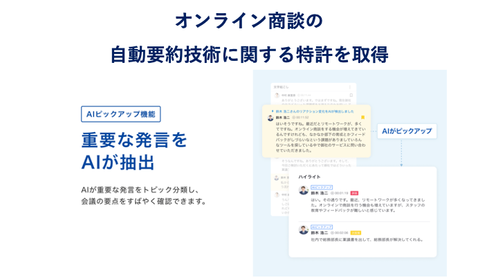 この度「ACES Meet」に搭載されている自動要約技術である「AIピックアップ」機能において特許を取得したことをお知らせします。本特許は、最先端の音声認識AIが商談動画から複数人の話者を自動で判別し、重要な発言をAIが抽出し要約する技術に関するものです。発言内容の要約に加え、商談の振り返りで欠かせないBANTC情報(予算、決裁権、必要性、時期、競合)や、商談運びにおけるコンテキスト情報(アイスブレイク、質疑応答、説明、クロージング)を特定し分類することが可能です。