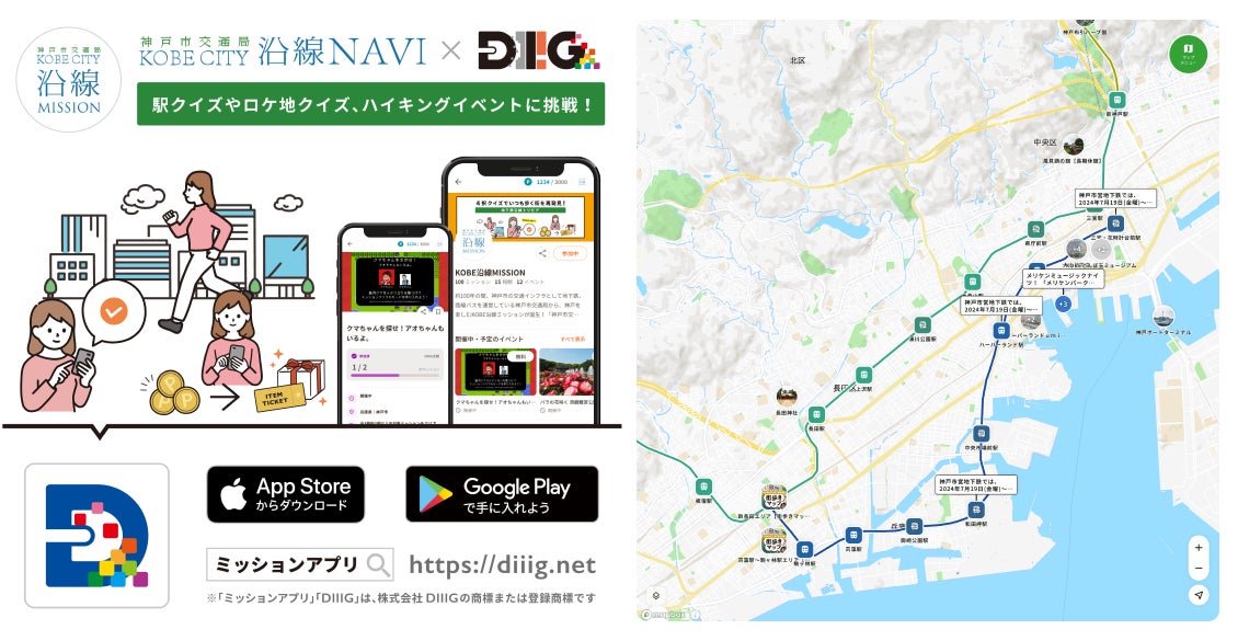神戸市交通局は、DIIIGとともに神戸市営地下鉄・神戸市バス乗降客数増加を目的に様々なイベントを企画してきました。2020年12月18日に、GPS(位置情報)を使ったミッションアプリ「DIIIG」を導入し、神戸市営地下鉄および神戸市バス沿線の情報発信サイト「沿線NAVI」と連携したワールド「KOBE沿線MISSION」を開設しました。2023年10月22日からは、デジタルマップの導入も開始し、地下鉄沿線の人流の増加や、デジタルマップを活用した新しい観光体験の提供を目指しています。