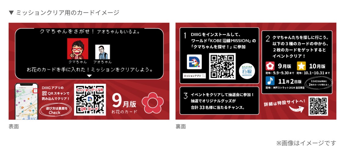 DIIIGが提供する「DIIIGのデジタルマップ」と連携し、不定期にマップ上に現れるワタナベフラワー クマガイタツロウ氏の移動情報をもとに、現地でターゲットを見つけて会いに行くと、クリア用のコードが記載されたカードを獲得できます。このカードのQRコードをアプリでスキャンすることでミッションをクリアすることができます。イベントをクリアすると抽選で合計33名様にオリジナルグッズが当たります。