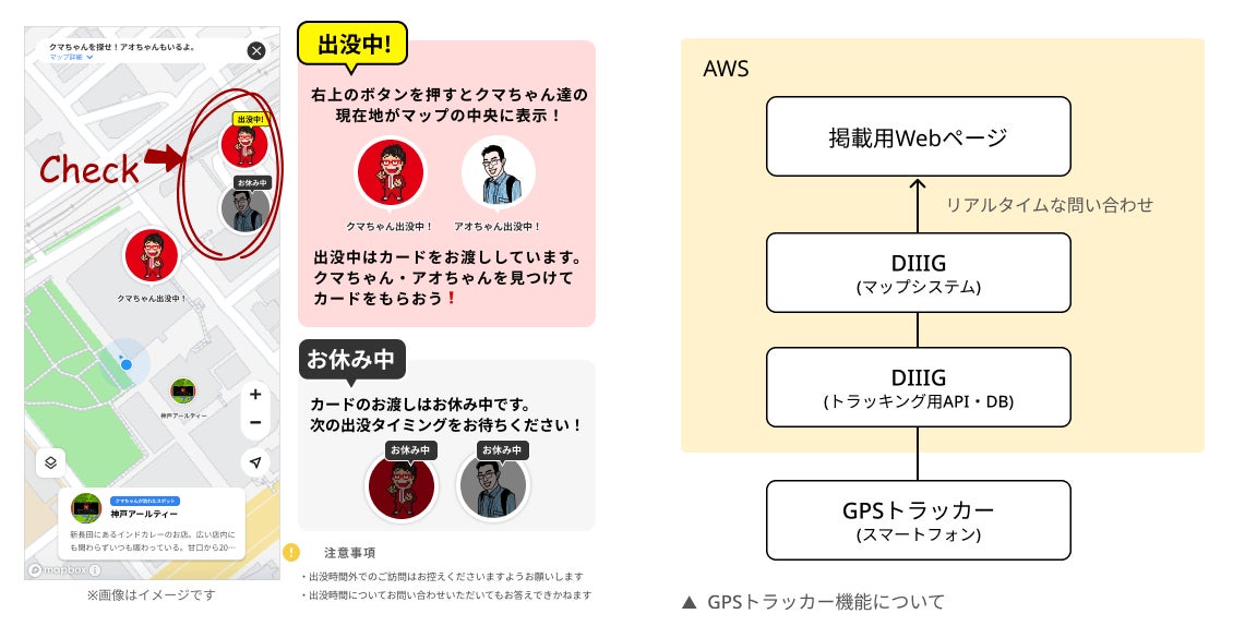 この機能は、GPSを活用し、指定されたターゲットの位置情報をDIIIGのデジタルマップ上にリアルタイムで反映するもので、様々な情報発信や観光体験の提供において広く応用が期待されます。