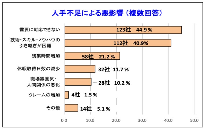 また、人手不足による悪影響について複数回答で尋ねたところ、「需要に対応できない」が44.9%、「技術、スキル、ノウハウの引き継ぎが困難」が40.9%、「残業時間の増加」が21.2%などとなり、経営者にとって人手不足解消は喫緊の課題となっている(図2)。