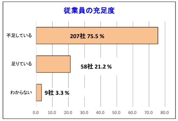 帝国データバンク旭川支店は、道北の経営実態把握を目的に、2022年9月5日から10月7日に道北地域(上川・宗谷・留萌・深川市以北の空知管内)に本社を置く売上高上位1000社を対象に、人材についてのアンケート調査「北海道・道北企業の人材に関するアンケート調査 URL: https://www.tdb.co.jp/report/watching/press/pdf/s221001_05.pdf (以下、同調査)」を実施し、274社から回答を得ている。同調査において、従業員が足りているかどうかを尋ねたところ、「不足している」と回答した企業は207社、率にして75.5%で、「足りている」とした企業の21.2%を大きく上回った(図1)。