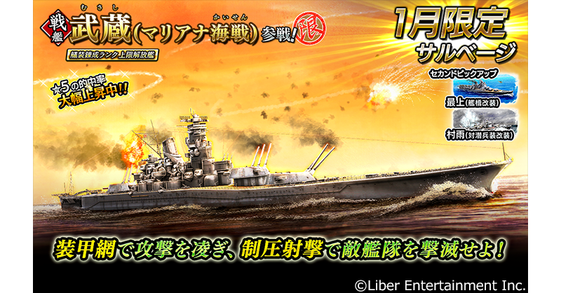 株式会社リベル・エンタテインメントは、男性向けオリジナルタイトル『蒼焔の艦隊』(そうえんのかんたい、iOS/Android/DMM Games)について、本日1月11日(水)より、新たに武蔵(マリアナ海戦)が参戦する限定サルベージが開催されたことをお知らせいたします。