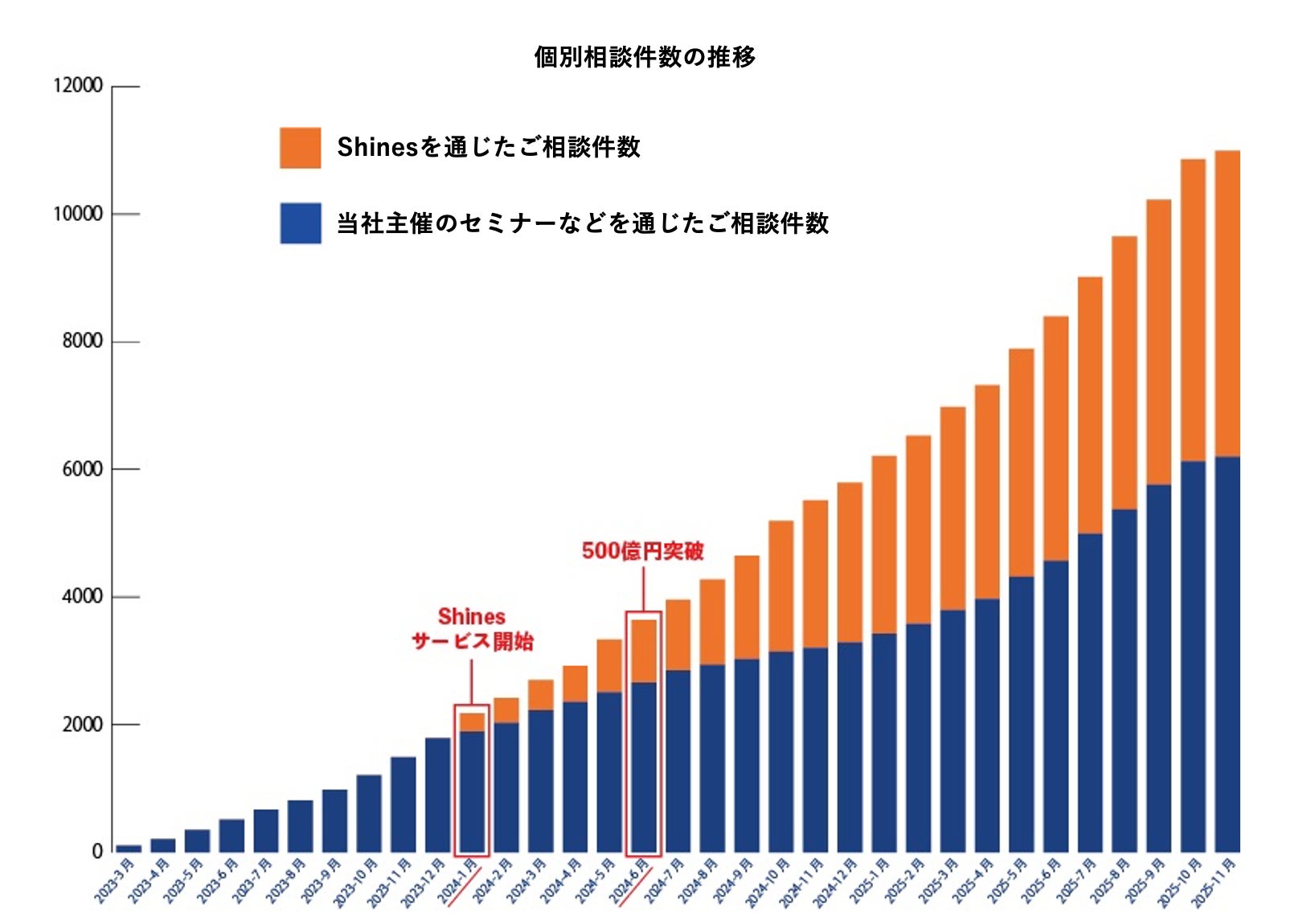 当社は、こうした状況の中で、創業以来培ってきた富裕層向けの資産運用アドバイスの知見と経験を基盤に、より幅広い顧客層へのサービス拡充を進めてまいりました。2023年9月のNECとの資本業務提携を契機に、大企業の従業員向け資産形成サービス「Shines」を開発し、様々な企業への導入を開始しております。また、退職金を受け取る世代を対象とした「退職金エール」など、ライフステージに応じたサービスの展開にも取り組み、退職者層を含む幅広いお客様からの支持を得ています。これらの取り組みが、2024年6月の500億円達成から約1年半で1,000億円を突破する成長を支えた大きな要因となりました。