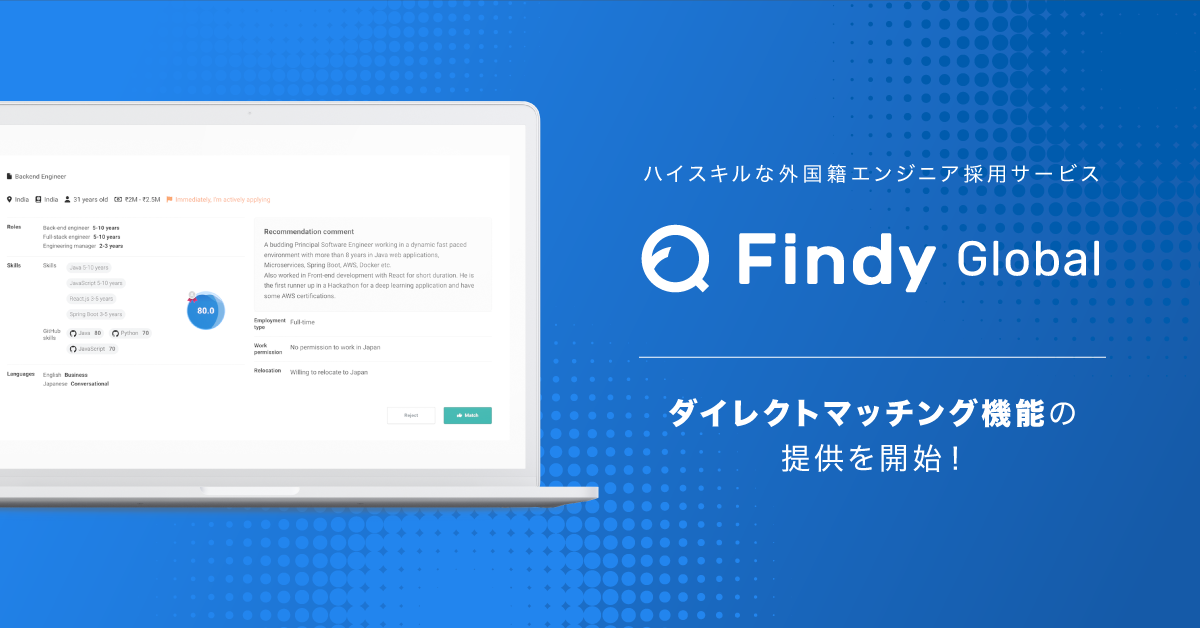 独自技術で外国籍エンジニア採用におけるスクリーニング課題を解決。Findy Globalがダイレクトマッチング機能の提供を開始。