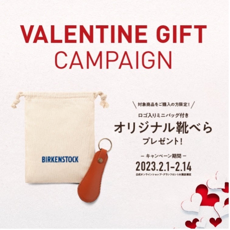 このリニューアルオープンを記念し、2月1日(水)から2月14日(火)まで、BIRKENSTOCK公式オンラインショップならびにBIRKENSTOCKグランフロント大阪限定で、バレンタインキャンペーンを実施いたします。対象商品をお買い上げの方に、オリジナルのバッグと靴ベラをプレゼントいたします。